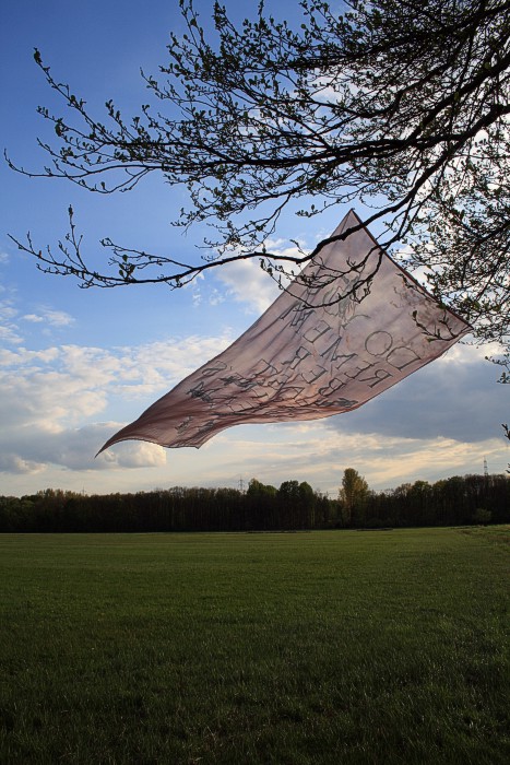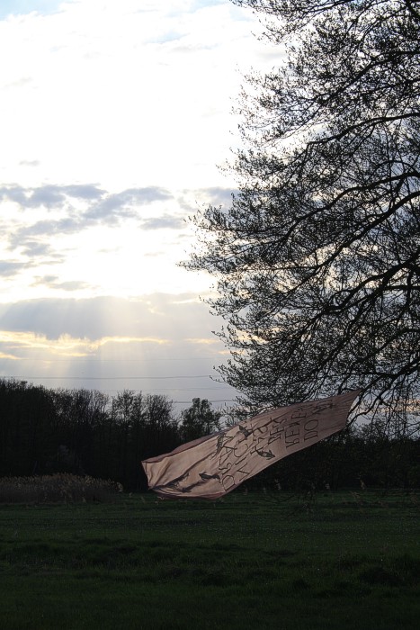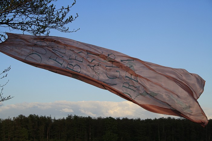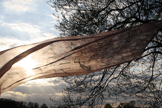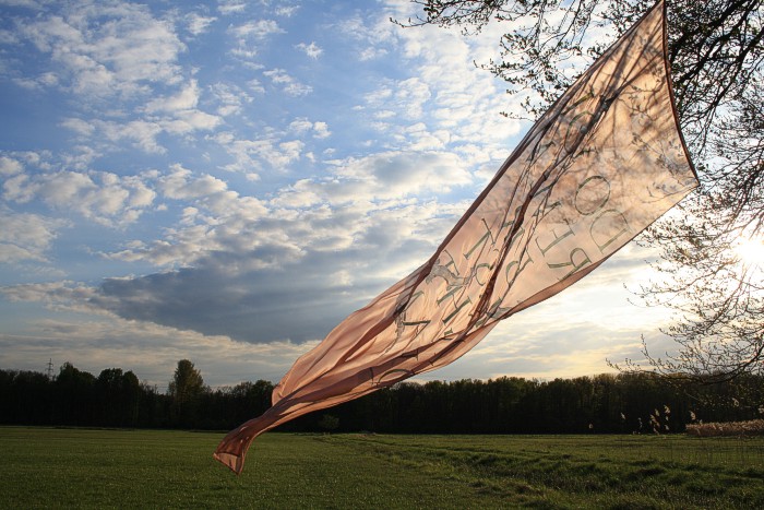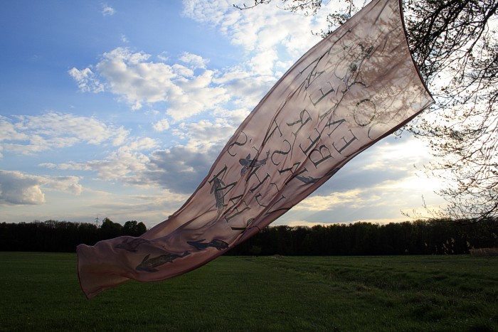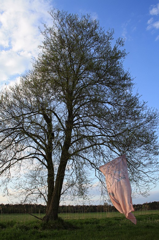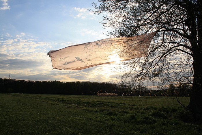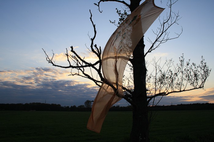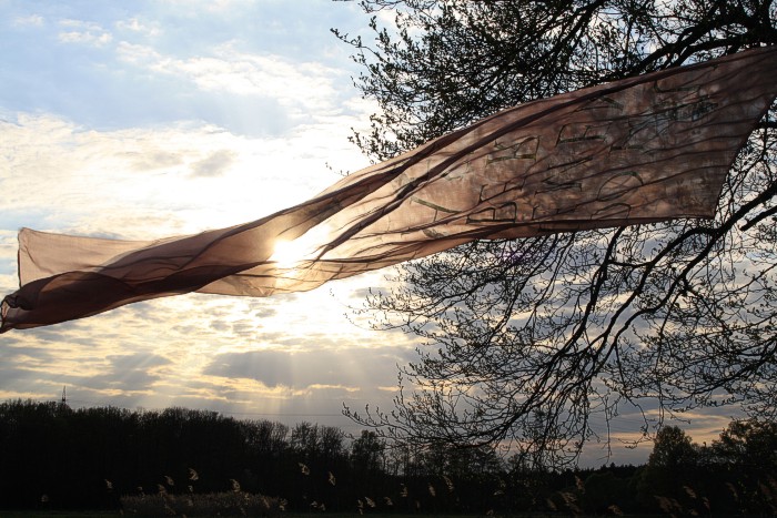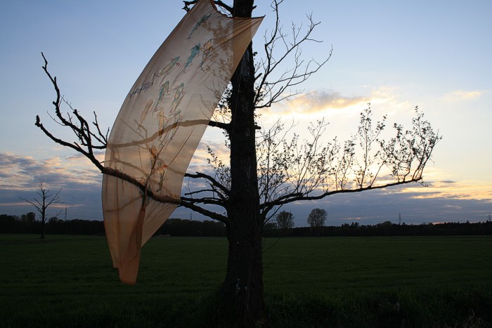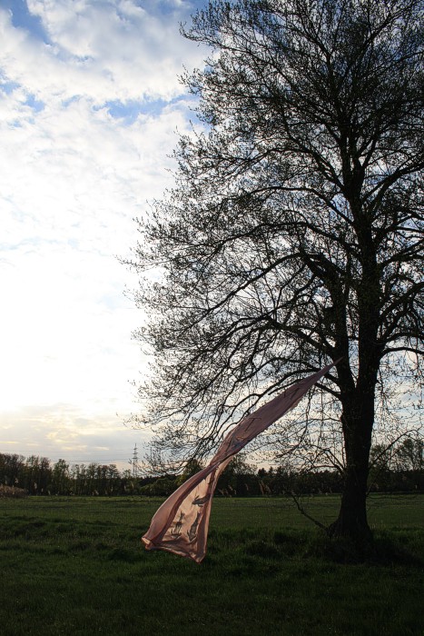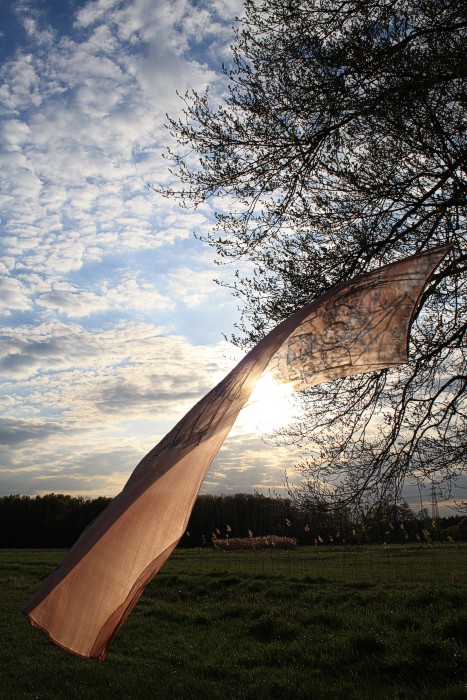 Tuch mit silbernen Fischen am 14. 4. auf einer Bruchwiese während der Abend hereinbricht. Wolken, leichter Wind