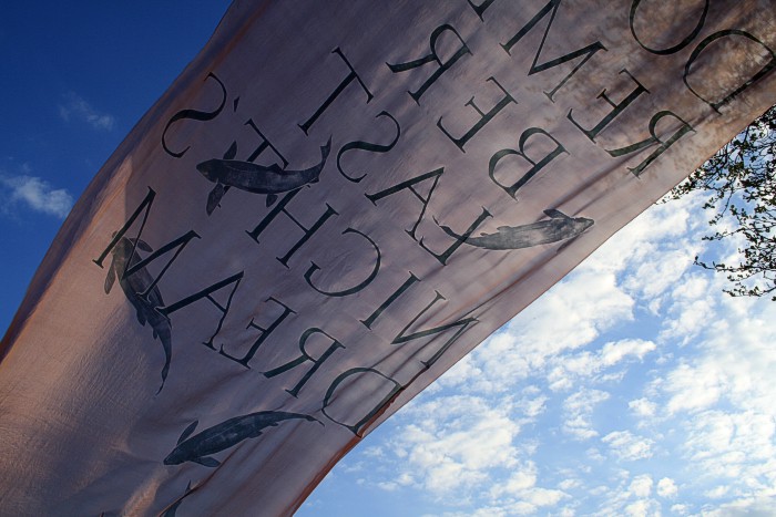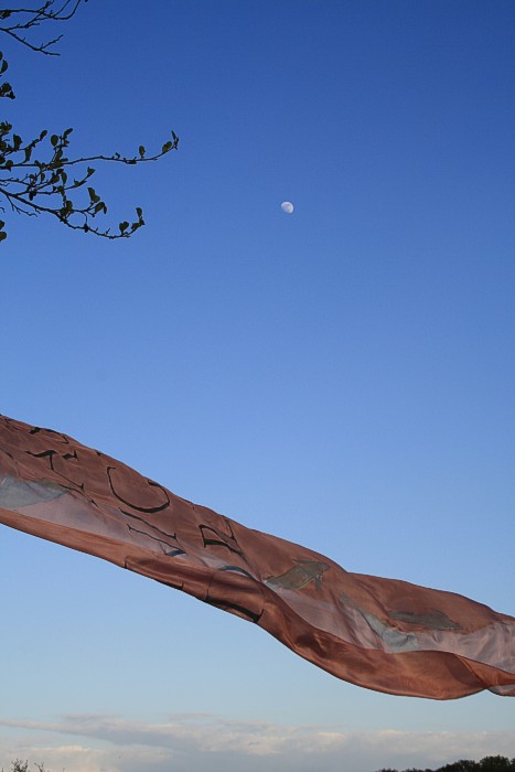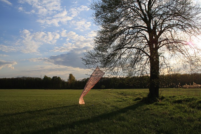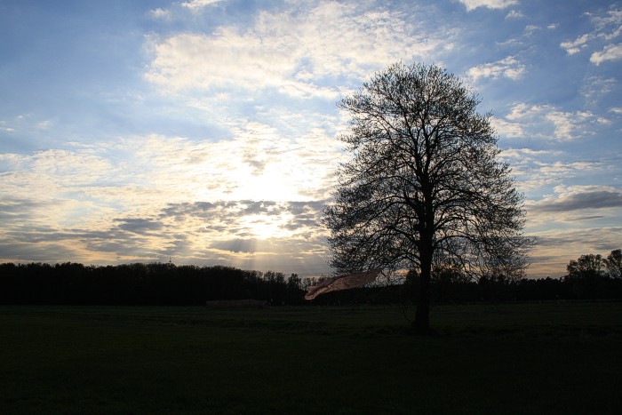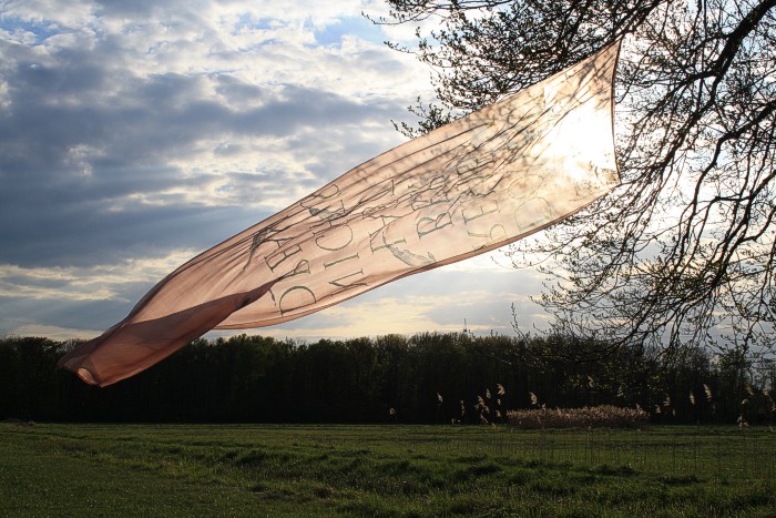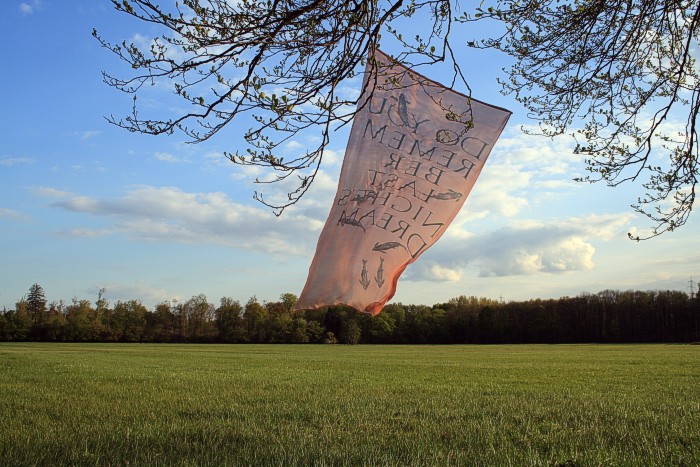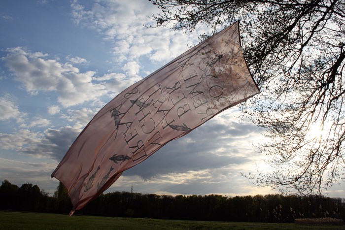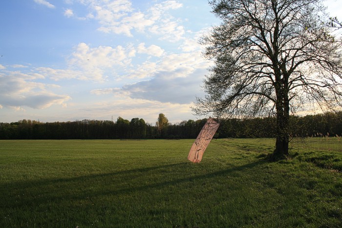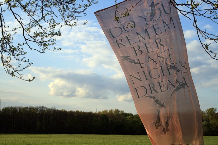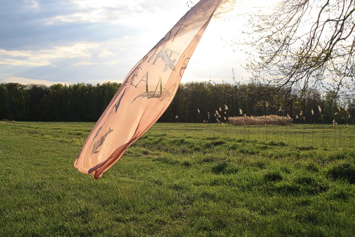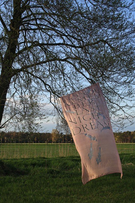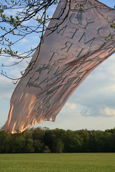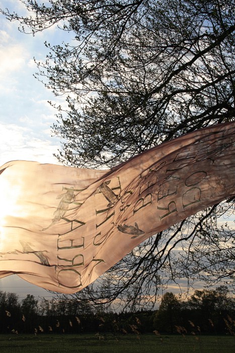 Tuch mit silbernen Fischen am 14. 4. auf einer Bruchwiese während der Abend hereinbricht. Wolken, leichter Wind