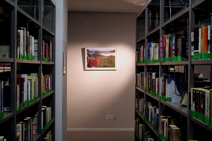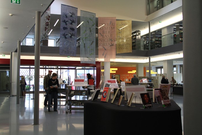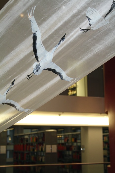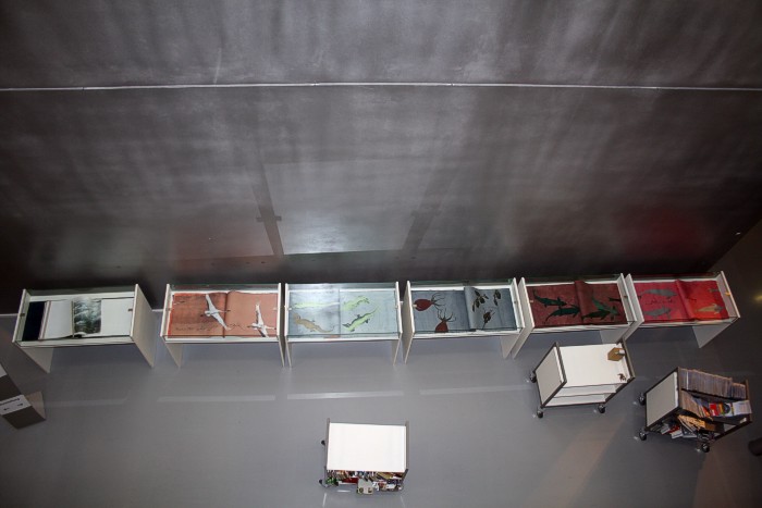 Die Vitrinen mit Seidensprachen-Künstlerbüchern im UG, von den oberen Stockwerken aus gesehen. | ![]() |