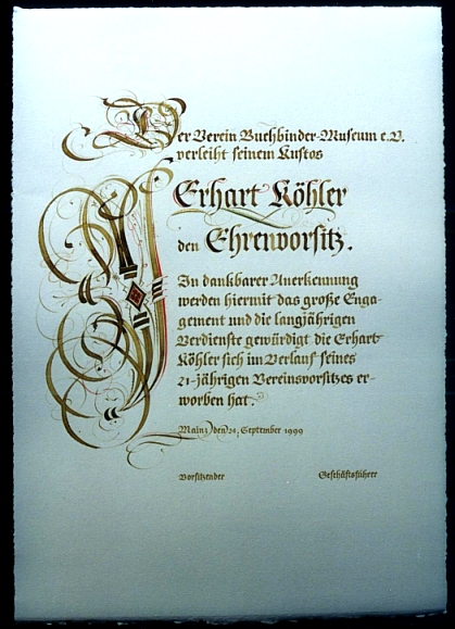 Urkunde für den Verein Buchbindermuseum e.V., Mainz, 1999
