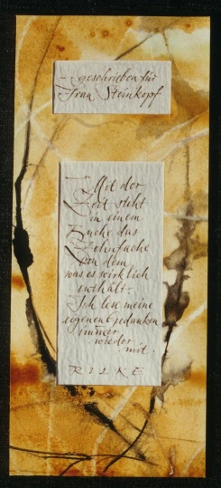 zwei bemalte Papiere gegeneinander geklebt, dazwischen transparentes "Onien-Skin"-Papier mit Kalligrafie. Größe ca. 6 x 16 cm