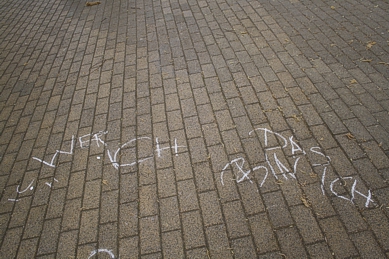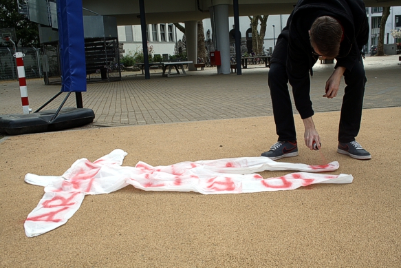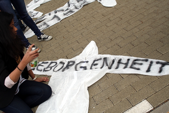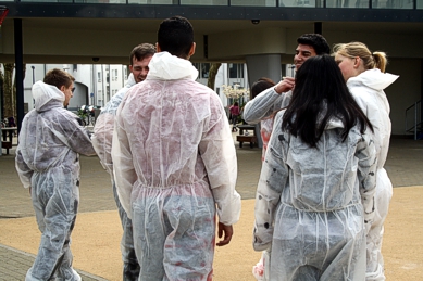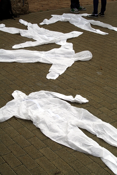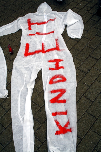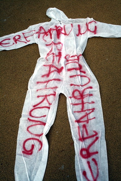 Diese Worte sprühten sie auf weiße Schutzanzüge. |