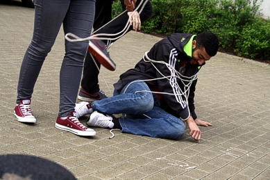 und wird während dieser Tätigkeit von anderen gefesselt. |
