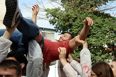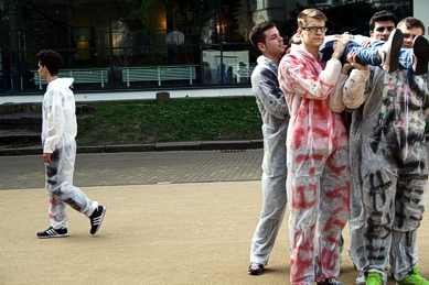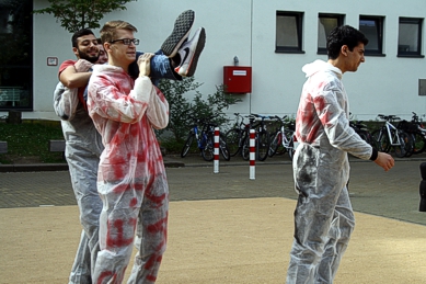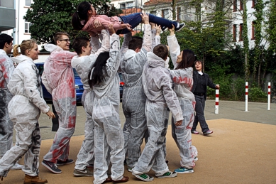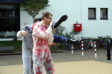 Die als Säulen gekleidete Gruppe hob einen Schüler hoch und trug ihn über den Schulhof |