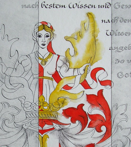 Altes Malerwappen, gezeichnet, z.T. mit Aquarellfarbe coloriert