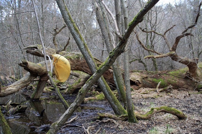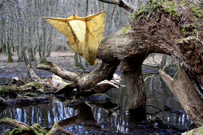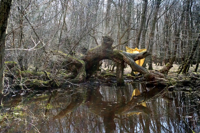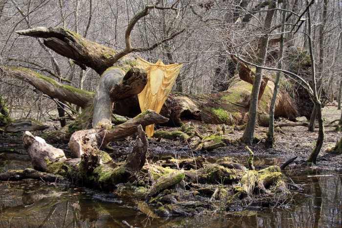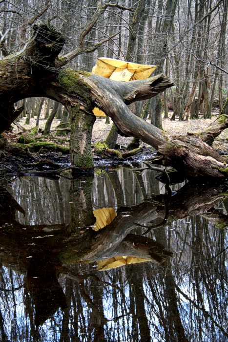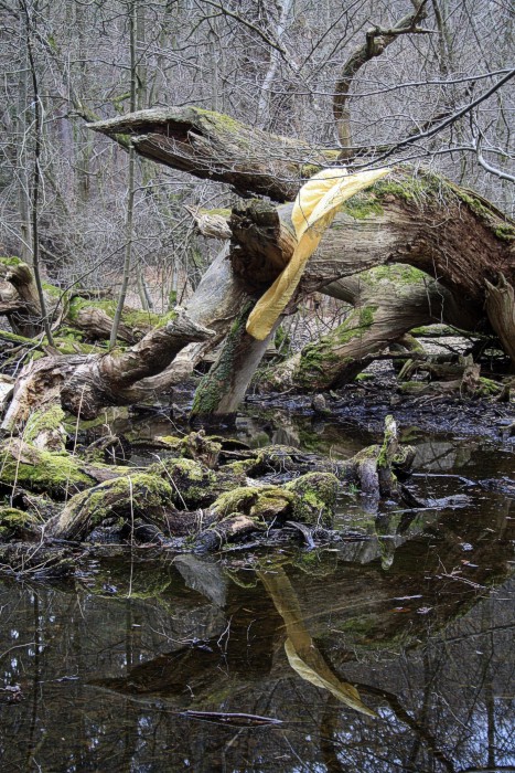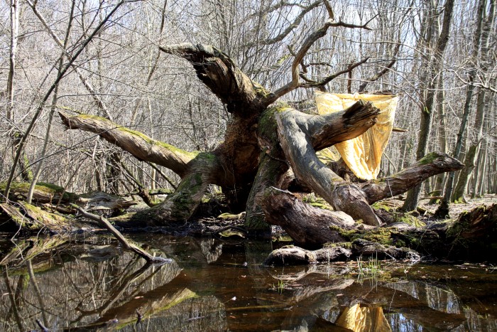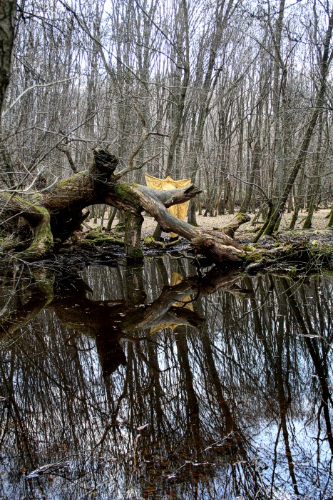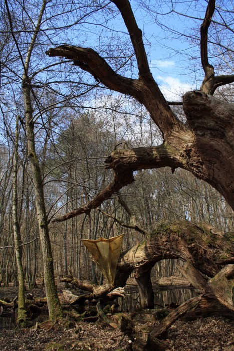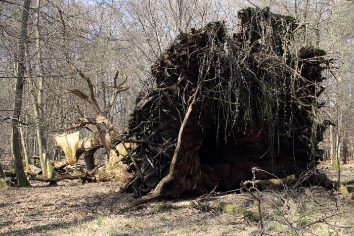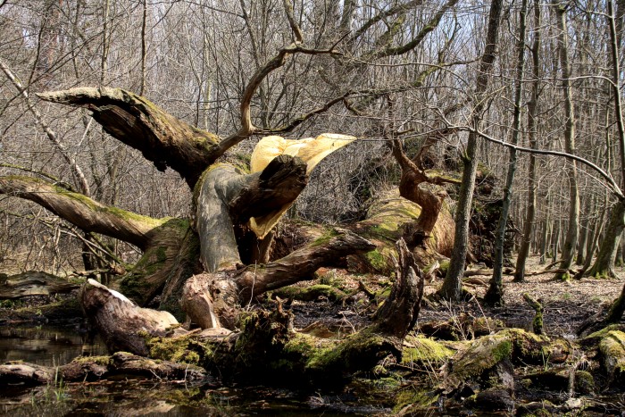 7.4. 2013, 12 -14 Uhr, vor Jahren umgestürzter Eichengigant tief im Wald, kleines Wasserloch, kalter, später Frühling