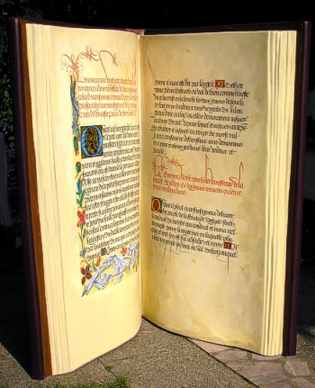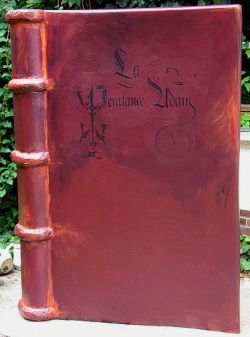 Bei diesem "Historischen Buchobjekt" handelt es sich um die Interpretation einer Burgundischen Prachthandschrift des Mittelalters, der Pénitance d´Adam (Brügge, zwischen 1472 und 1484). Der Kalligraph, Illuminator, Übersetzer und später auch Drucker Colard Manison fertigte in seiner Schreibwerkstatt vor allem Luxusmanuskripte für hochmögende Kunden. Diese “Bestrafung Adams” wurde von dem bibliophilen und kunstsinnigen Adeligen Ludwig van Gruuthuse in Auftrag gegeben. |