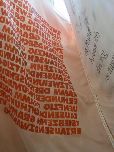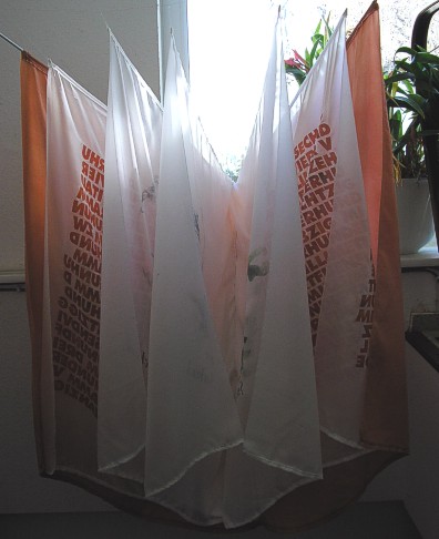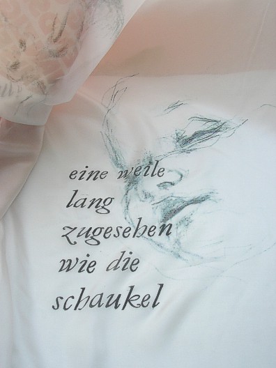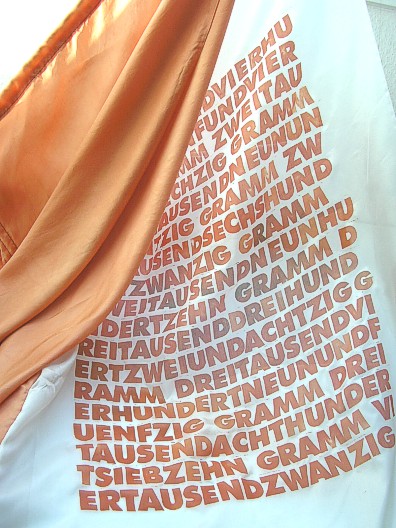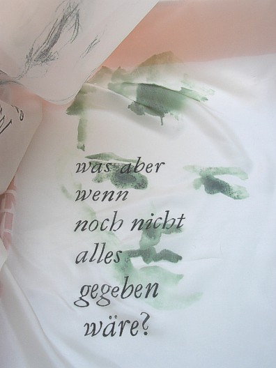 Breite:63 cm Höhe:88 cm Decke aus Seidentwill 5 Seiten aus Pongé-Seide erste und letzte Seite bedruckt, futura fett innen Stempeldruck garamond kursiv + Inkjet-Druck (Zeichnungen)
