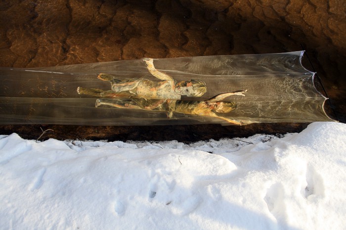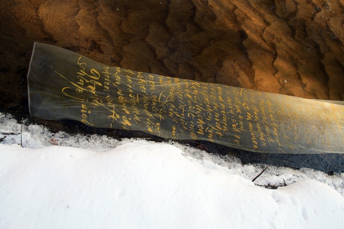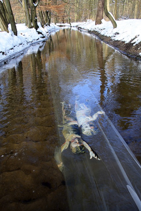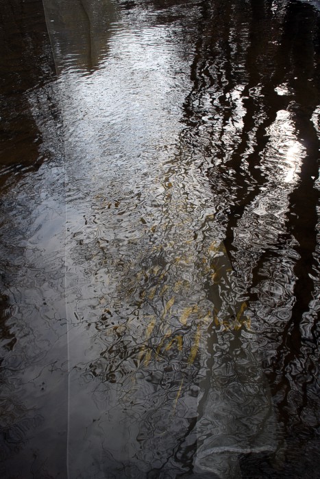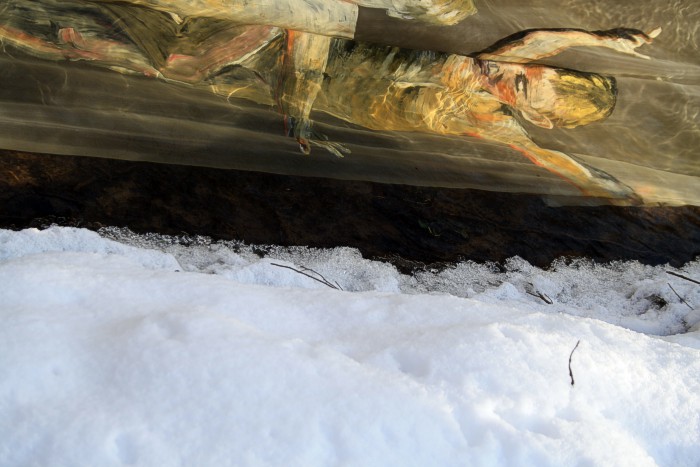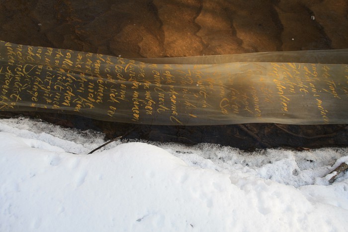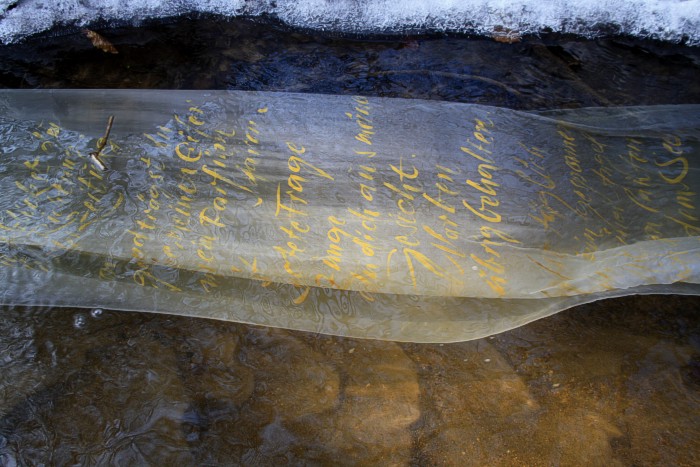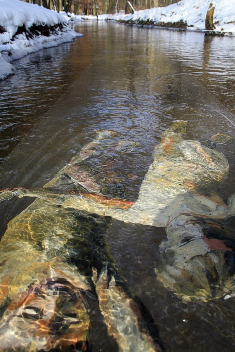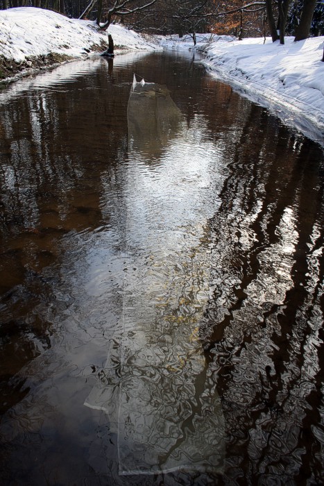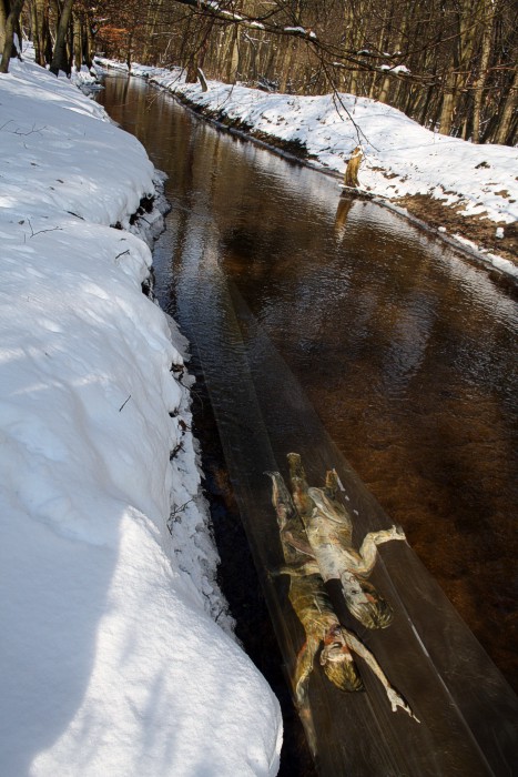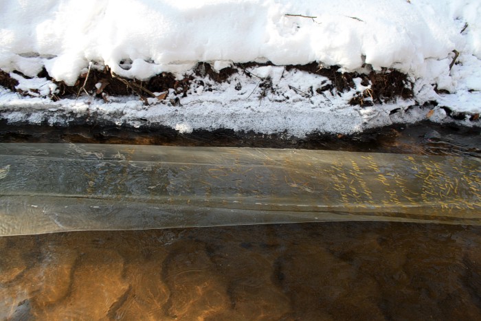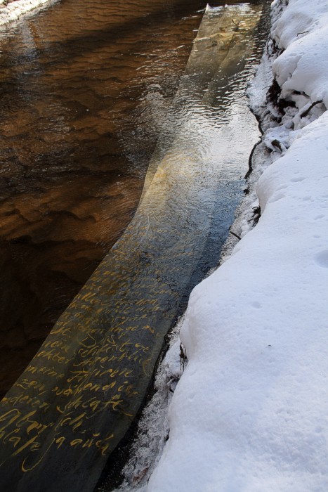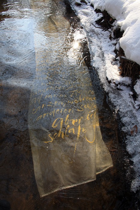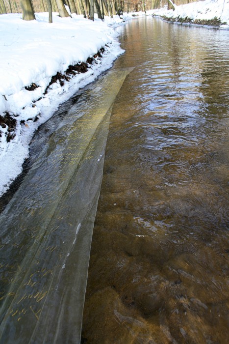 15. 3. 2013, 11 Uhr, Bach mitten im Wald nach spätem Schneefall im Frühjahr. Sonne, Halbschatten, um 0 Grad