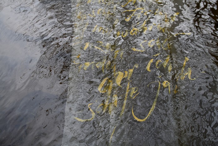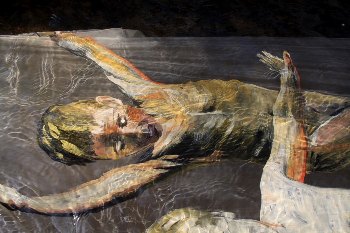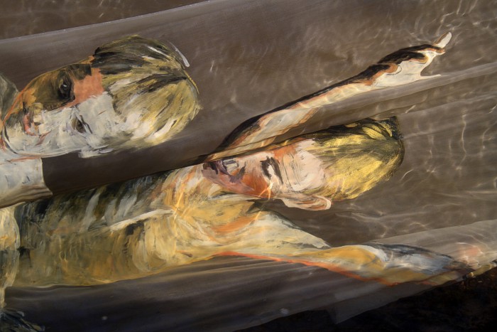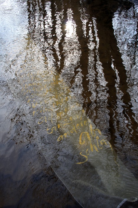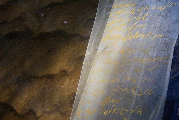 ca. 7m langes Seidentuch, Acrylbild Kinder, darunter Handschrift (Acryl), 4 Texte zu Kindern