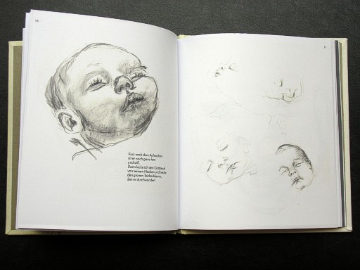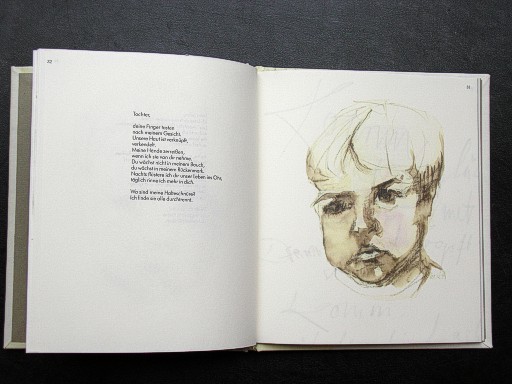 Die Kinderbilder sind nach realen Modellen, in deren Anblick sich die Künstlerin versenkt hat, gezeichnet. Sie sollen ihnen unbedingt, um ihrer selbst willen, ähneln. Es sind die Porträts der eigenen Kinder, in denen sich deren Eigenart in Haltung, Mimik und Gestus bis zum außergewöhnlich Einmaligen äußert und eine Entwicklung von neun Jahren spiegelt. |
