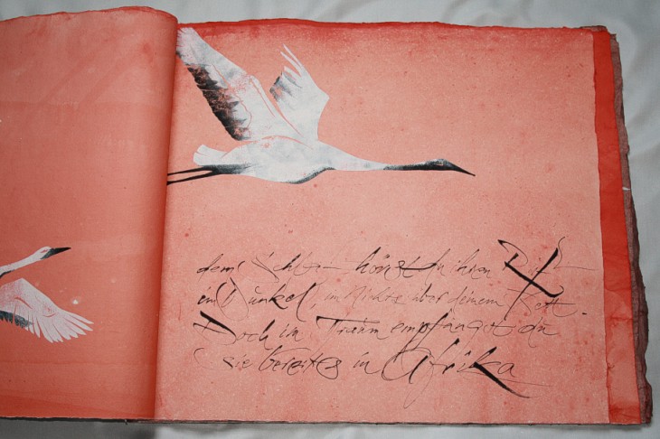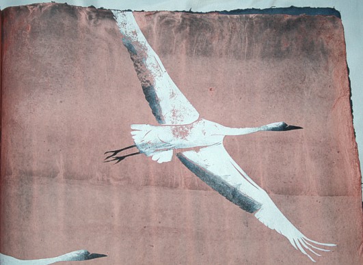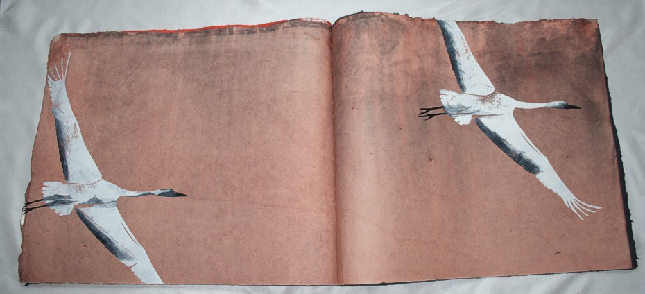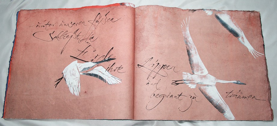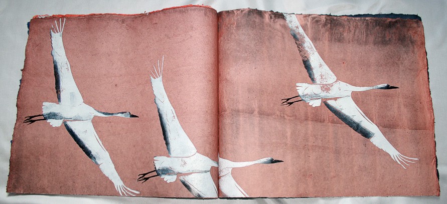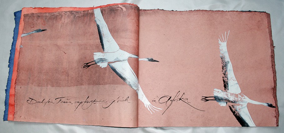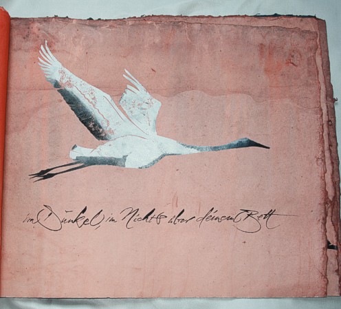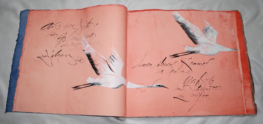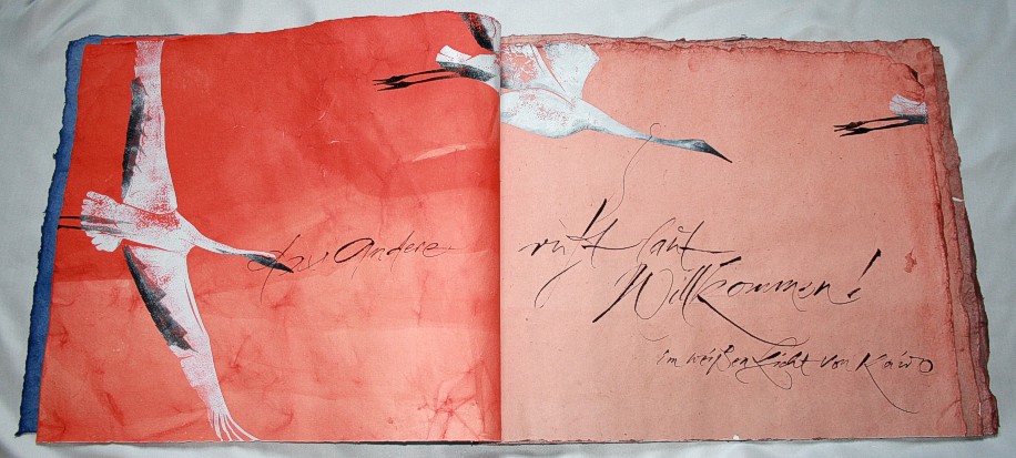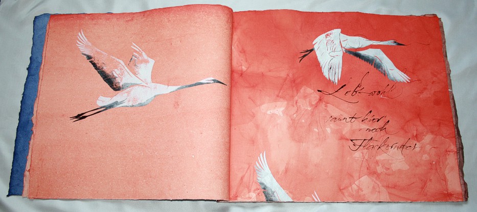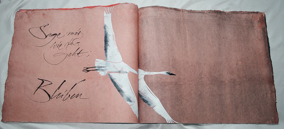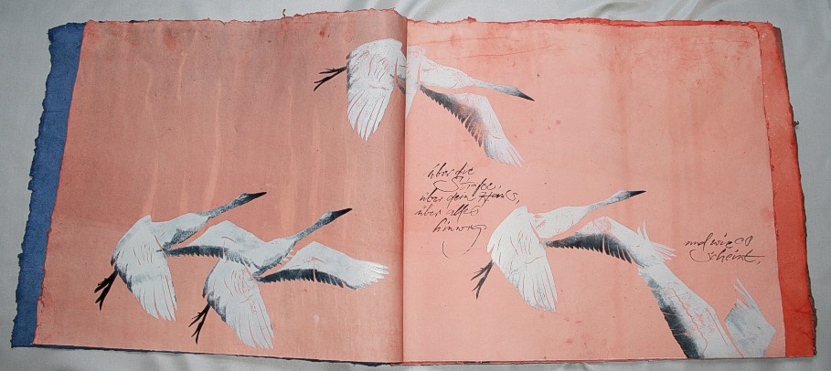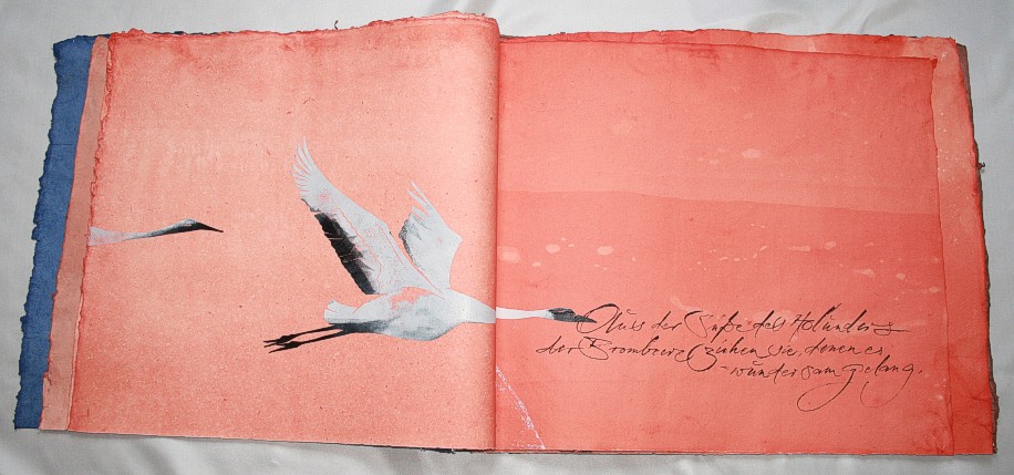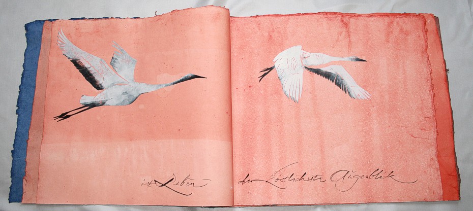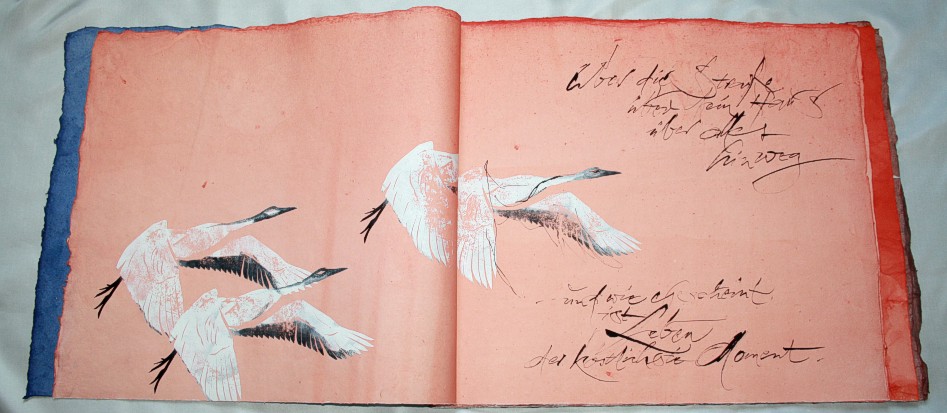 "Kranich" liegt momentan in zwei Exemplaren vor, die sich leicht voneinander unterscheiden. (Eines ist vom Klingspor-Museum in Offenbach bestellt/reserviert.) Anfertigung auf Bestellung. Sie sind die Weiterentwicklung des "Kranich-Projekts", welches als Video-Installation geplant und ausgeführt wurde. Siehe hier Die für dieses Projekt entstandenen Druckstempel der ziehenden Kraniche setzte ich hier nicht auf Seide, sondern auf grobem Hadernbütten ein. Das Papier wurde zuvor gefärbt. |