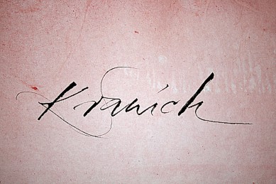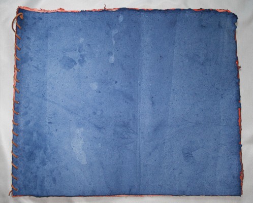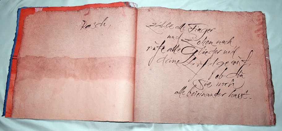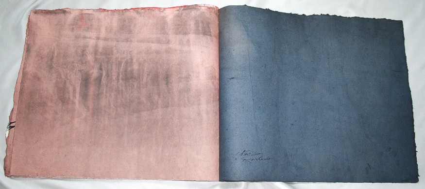 Breite:61 cm Höhe:51 cm 12 Seiten aus Silberburg-Hadernbütten (schwer) 10 Motivseiten mit Lederband in Deckblättern geheftet Motivstempel und Handschrift Entstehung: Oktober 2010 |
