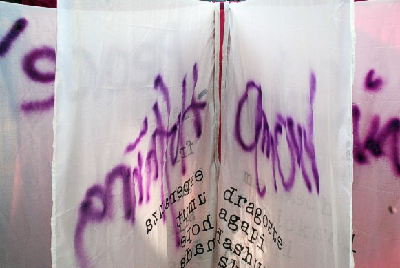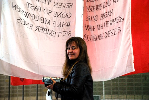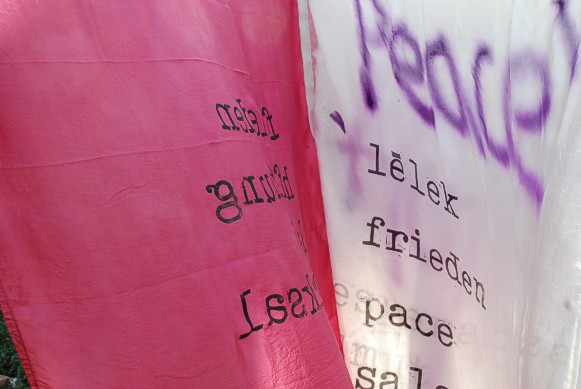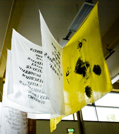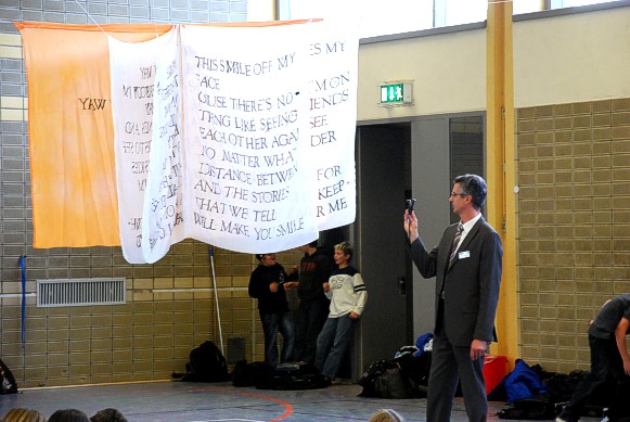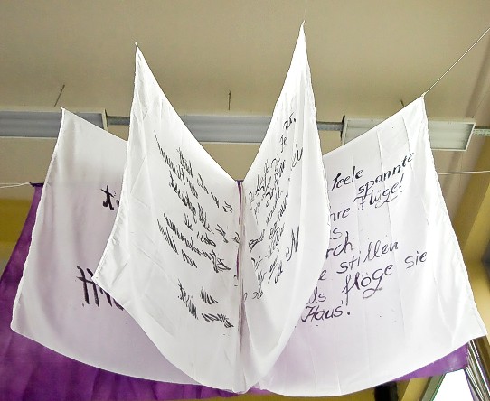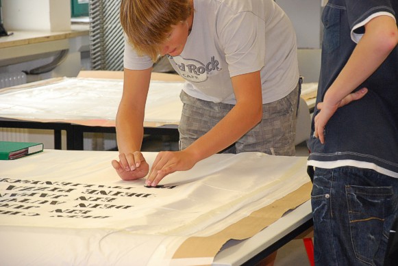 Währen die jungen Musiker mit AG-Leiter Florian Kugelstadt und den Instrumentallehrern Ully Leonhardt, Marc Jullien und Helge Haumann in phantastisch kurzer Zeit die neuen Songs einstudierten, druckten und schrieben ihre Mitschüler unter Anleitung des Kunstlehrers Martin Dürk und der Groß-Gerauer Künstlerin Tanja Leonhardt Texte und Gedichte auf große Seidenbahnen. Diese wurden zu Seidenbuchobjekten zusammengenäht, mit denen Tanja Leonhardt schon an der Mainzer Universität und an mehreren Schulen wie z.B. in Seligenstadt und Rodgau sowie auch in Schärding/Österreich für kulturelles Staunen gesorgt hat (die Hessenschau berichtete). Besonders bereichernd war in diesem Fall die Modifikation ihres Konzeptes, die Seidenbücher mit musikalischen Darbietungen zu verbinden - ein spannender Ansatz, der sich im nächsten Jahr vielleicht auf Kooperationen mit weiteren Fachklassen ausdehnen lässt; denn alles, was Menschen denken und fühlen, hat seinen Platz auch zwischen Buchseiden.
