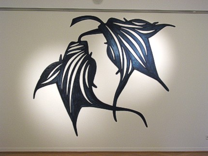 Podai-Malerei, das zugleich das Logo der Ausstellung ist. Ihm ist die Formensprache des Titel-Schriftzugs entnommen. Auch in der Farbigkeit entsprechen die beiden Motive einander. Sind uns die Blauschwarz-Modifikationen bereits aus der Tätowierung vertraut, so entstehen sie