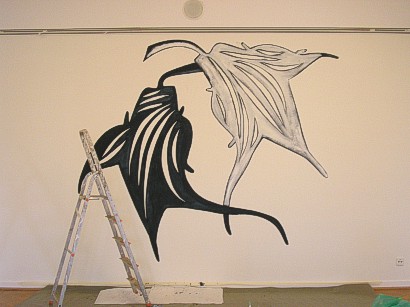 beim Aufstieg in den zweiten Stock, begegnet man einem wandfüllenden Bild, welches als Pendant zum Titel-Schriftzug genau