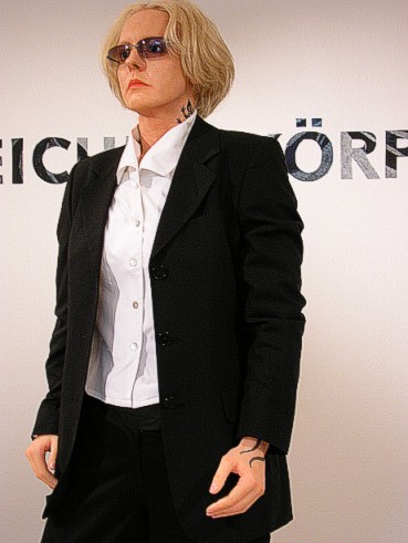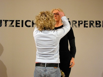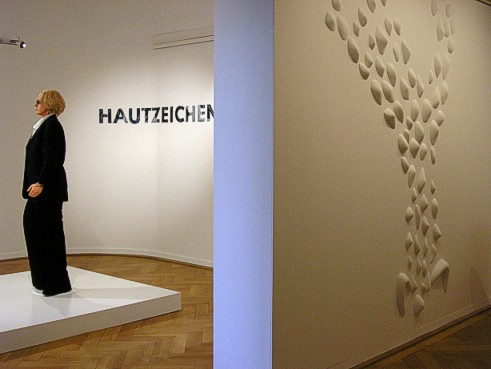 Die Korrespondenz des blauschwarzen Tattoo-Motivs setzt sich von dort über den Titelschriftzug bis zum Podai-Logo der zweiten Etage fort. Die Eidechse als Motiv wurde intuitiv gewählt. Später erst erläuterte uns der Kurator, dass es bei den Maori nur ein Wort für Tätowieren und Eidechse gibt. Die Echse als gefährlich und giftig, negativ besetzt. In ihr kommt eine lauernde Gefahr zum Ausdruck. Die Figur spielt mit dem Dämon im Handtaschenformat, scheinbar gebändigt. Was aber, wenn die Wand dahinter durchlässig würde? ...