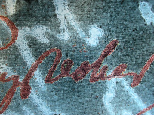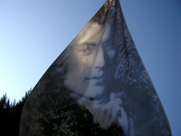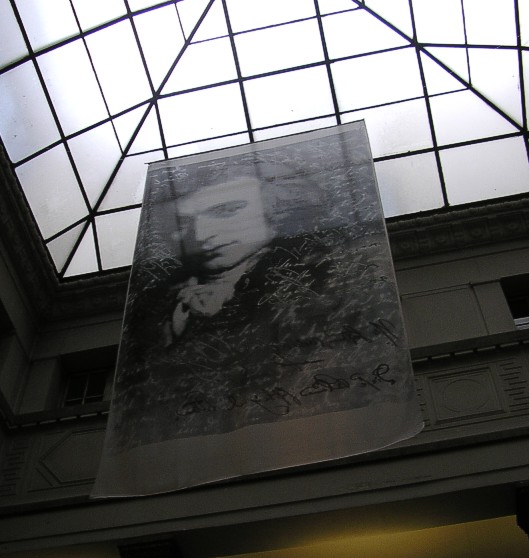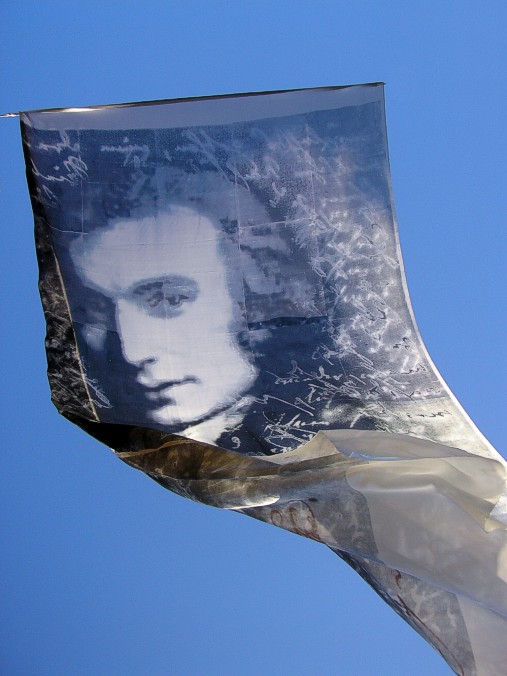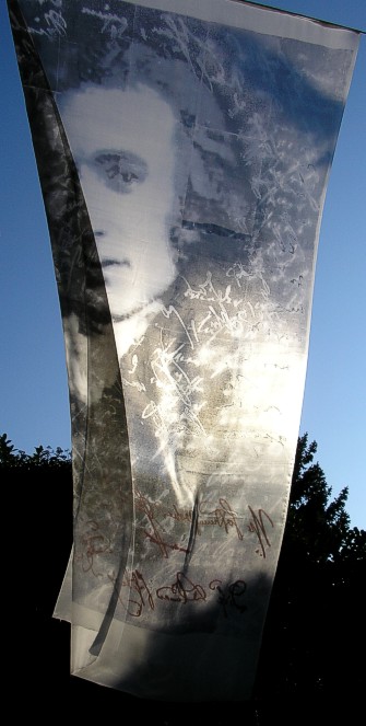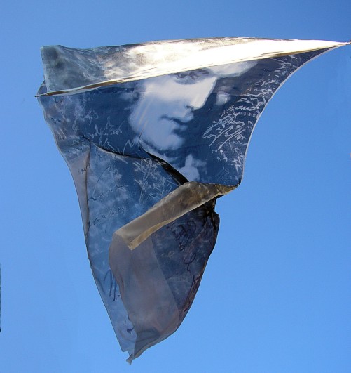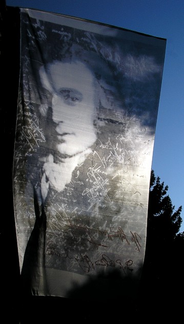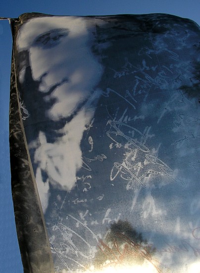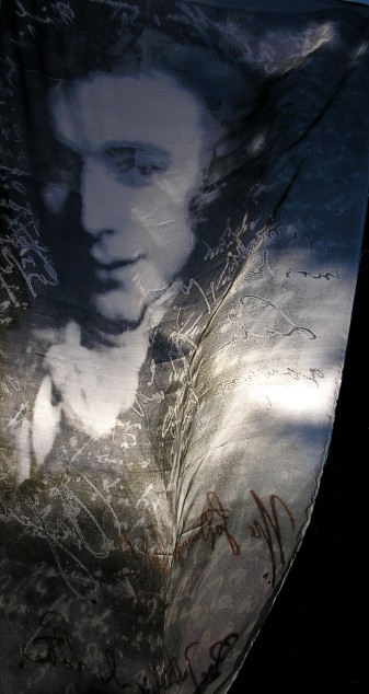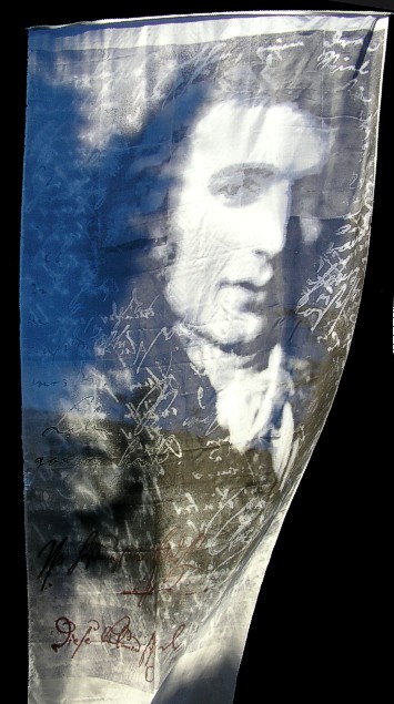 gestaltete ich ein Seidentuch (2,60 x 1,40). Es setzt sich aus einem Portrait Schillers und seiner Handschrift zusammen.