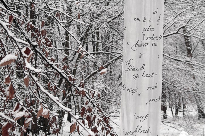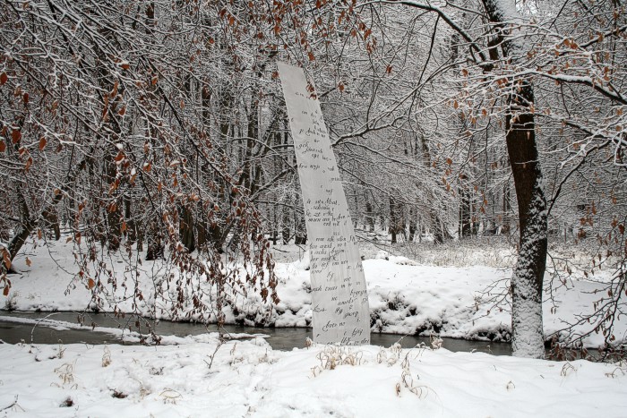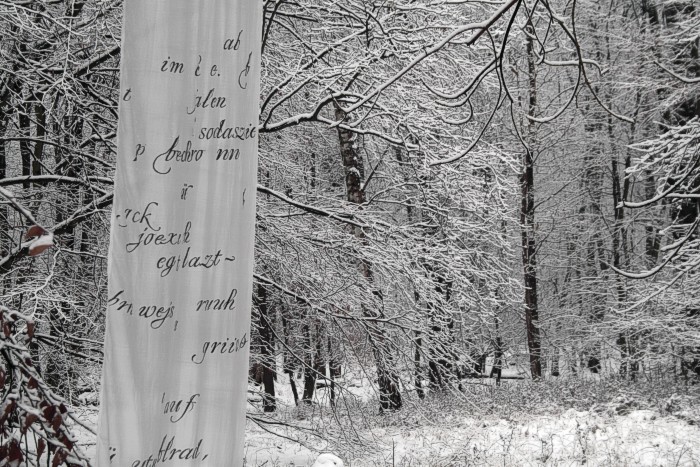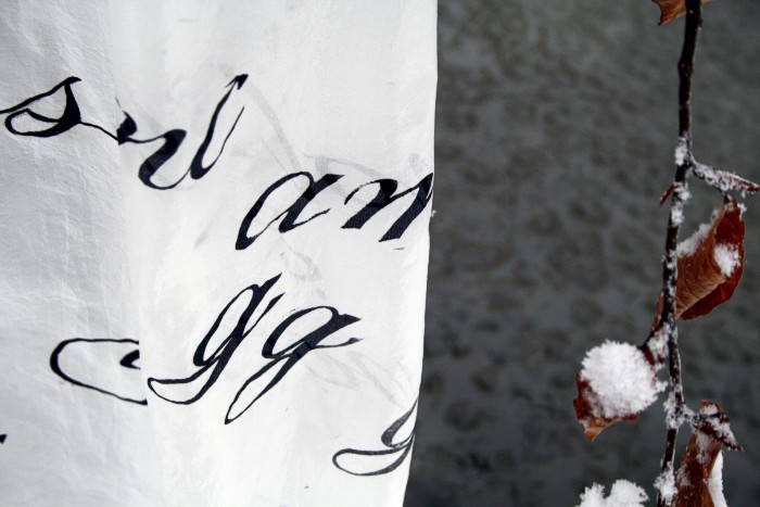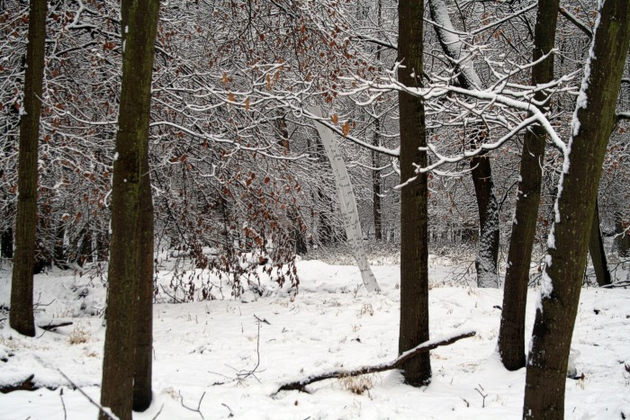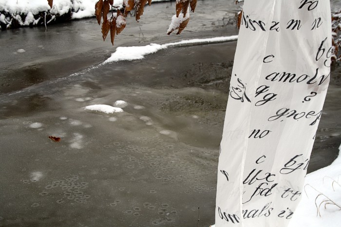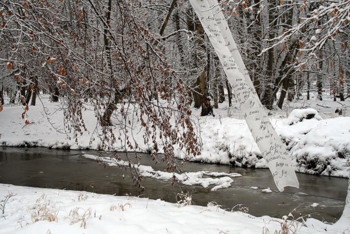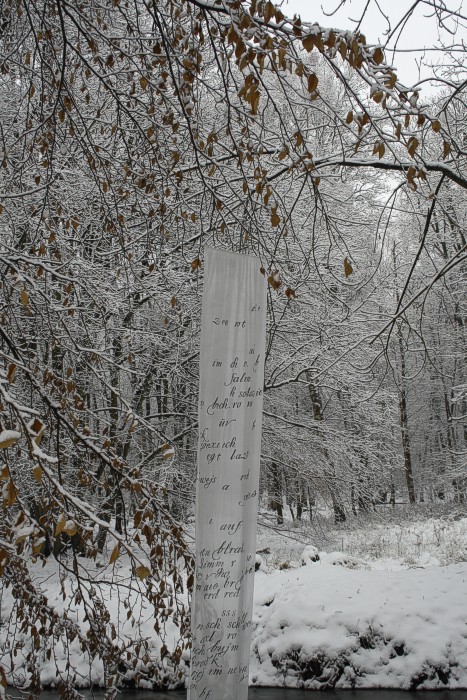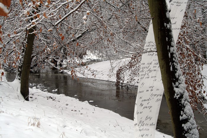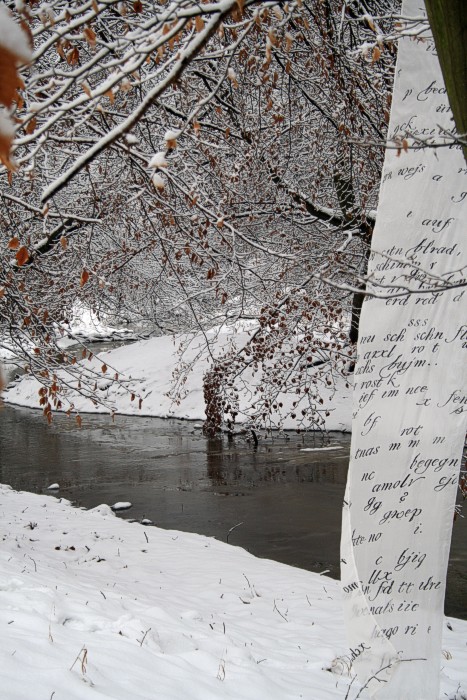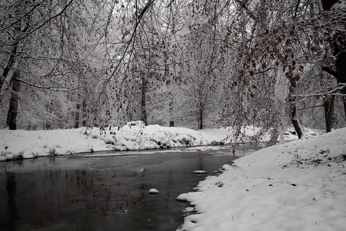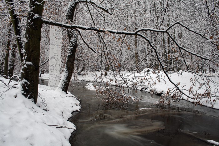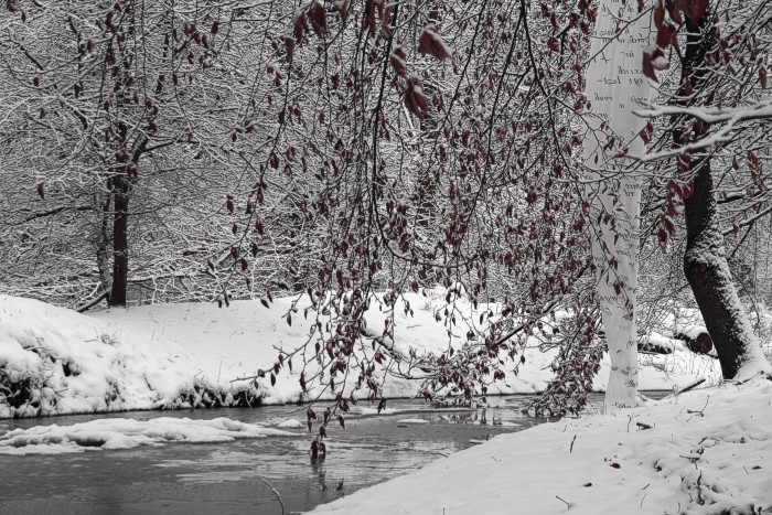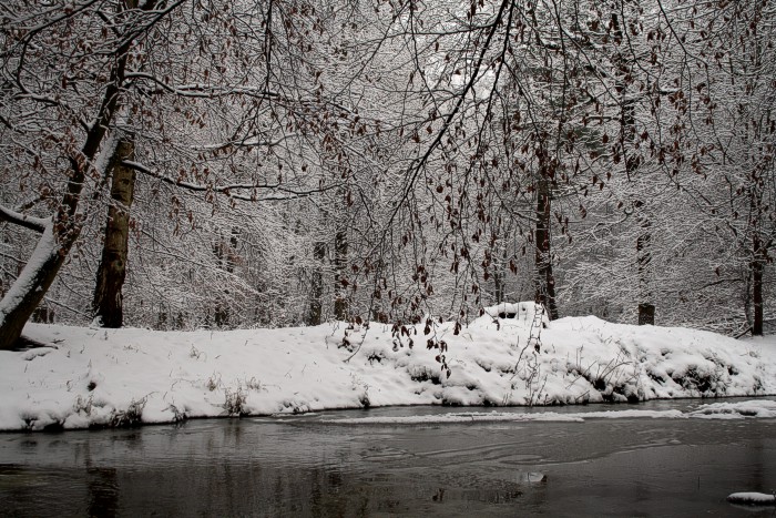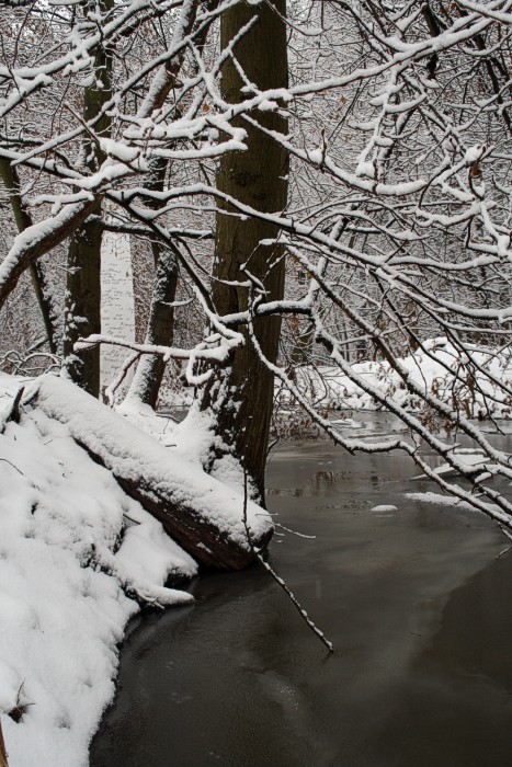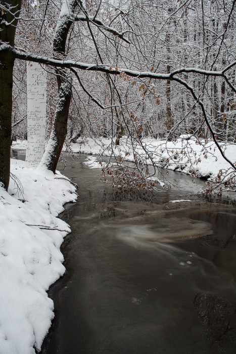 21.1. 2013, 12:40 Uhr, Bach mitten im Wald nach Schneefall in der Nach. Windstill, um 0 Grad