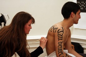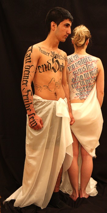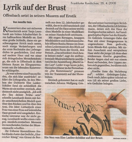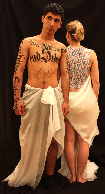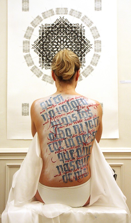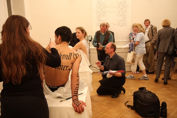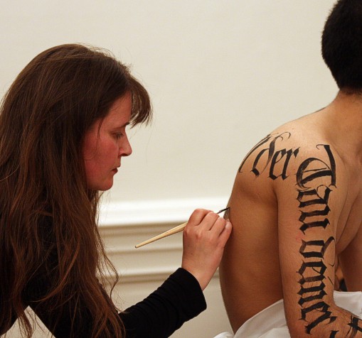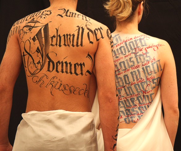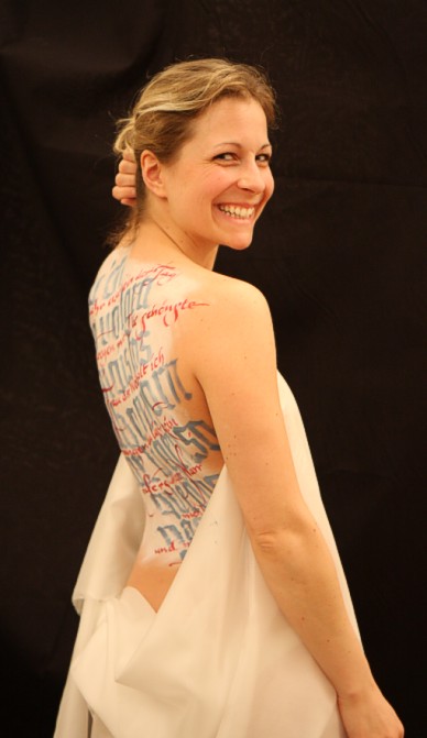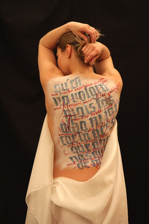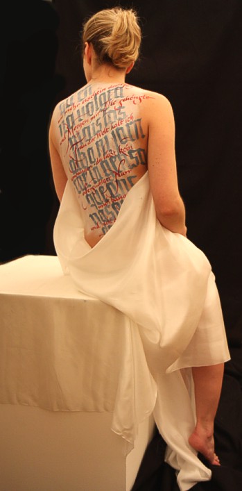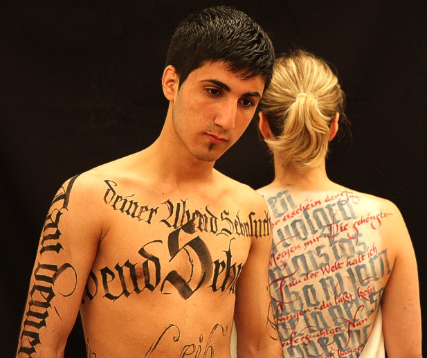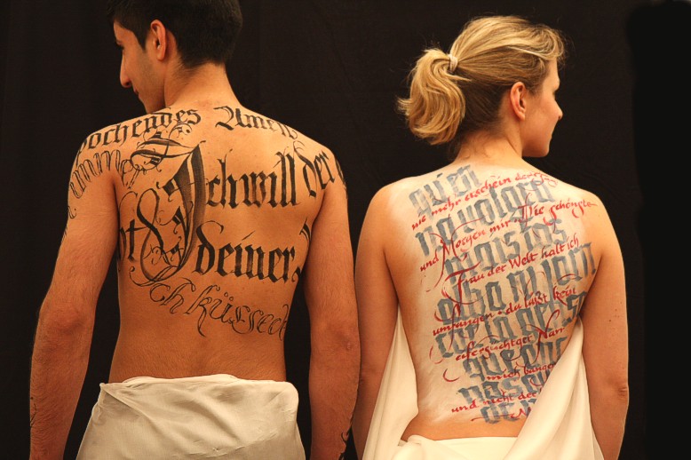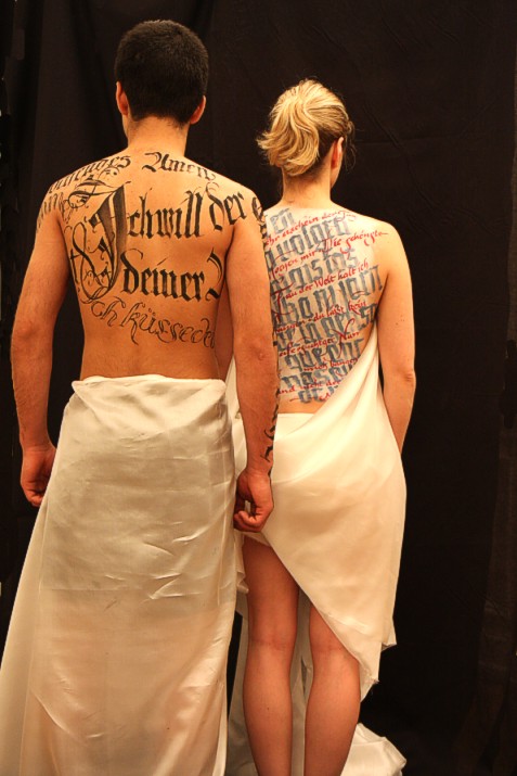 Sinnliches Schreiben - "Lange Nacht der Museen 2008" im Offenbacher Klingspor Museum 26. April, von 21:00 bis ca. 23:00 Uhr Nach der Aktion "Schrift mit der Kettensäge" im Vorjahr, freute ich mich, wieder gemeinsam mit Stefan Kindel zu einer langen Museumsnacht beitragen zu dürfen. In diesem Jahr ging es ruhiger zu. Unter dem Motto "Klingspor geht auf/unter die Haut" beschrifteten Stefan Kindel und ich die Oberkörper zweier Modelle mit Liebeslyrik. Dualität war mir dabei ein wichtiger Aspekt. So war es mein Plan, dass die Worte einer weiblichen Dichterin von mir auf ein männliches Model, und Worte aus männlicher Feder sollten von einem Mann auf einen Frauenkörper geschrieben werden. So, wie die Liebe selbst Zeit zur Entfaltung braucht, sollte auch der Prozess der Beschriftung als ein zeitlicher erfahrbar sein.