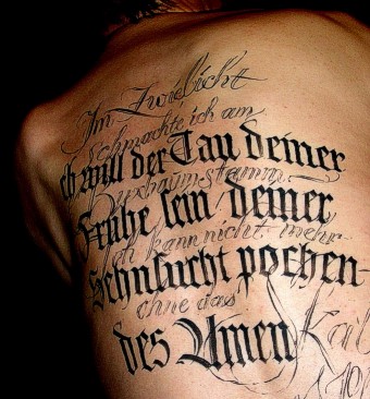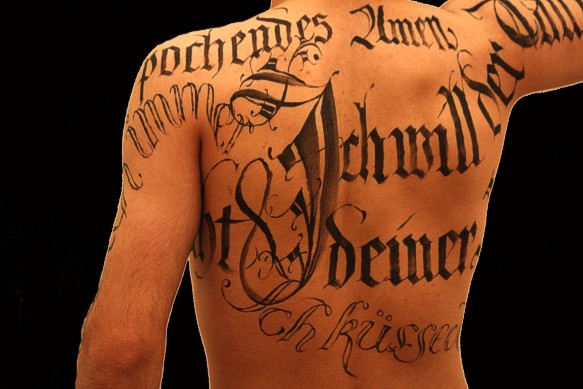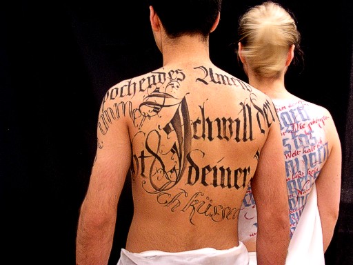 Ich komme auf dieses Thema durch meine Arbeit im Museum für Weltkulturen, das 2006/07 die Ausstellung "Hautzeichen-Körperbilder" zeigte. Ich arbeitete während der Aufbauphase im Frühjahr 2006 einige intensive Wochen im Museum und schrieb die gesamten Ausstellungstexte an die Wände. (Siehe hier) Während der Arbeit konnte ich tief in die Thematik eintauchen und hatte viel Zeit, alleine mit den Exponaten und den Texten. Geblieben ist mir das Bewusstsein, dass Schrift auf Haut eine außerordentliche Bedeutung zukommt. Da diese Bedeutung im Bereich der Körper-Identität fällt, hat der aufgeklärte Mensch sie restlos negiert und in die Ecke von Schmutz und Kriminalität verbannt. Seit einigen Jahrzehnten schert sich die Subkultur einen Dreck um die gesellschaftliche Ächtung von Körperbeschriftung und macht das Tattoo als Akt der Verweigerung wieder aktuell. Inzwischen ist das Bildchen auf der Haut zum neckischen Modeaccessoire verkommen. Stars lassen sich chinesische Zeichen stechen, von denen sie nicht einmal die Bedeutung kennen - und laufen dann mit Nonsens am Knöchel oder im Nacken durch die Welt. Wieder einmal denke ich: Schrift kann mehr!