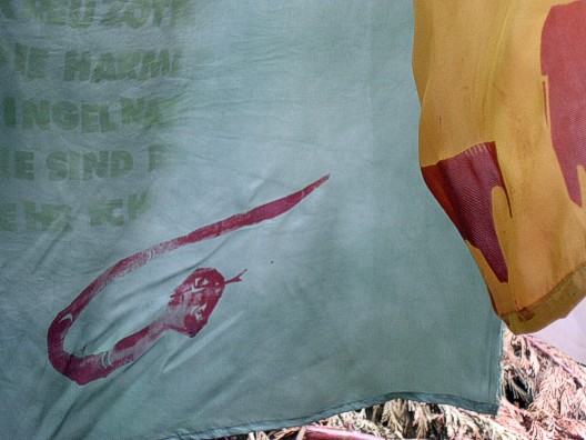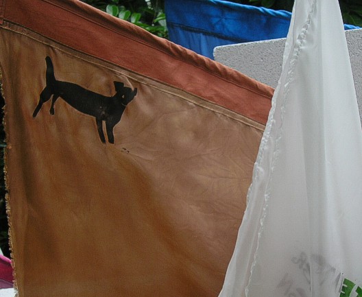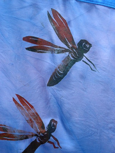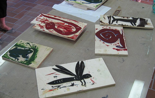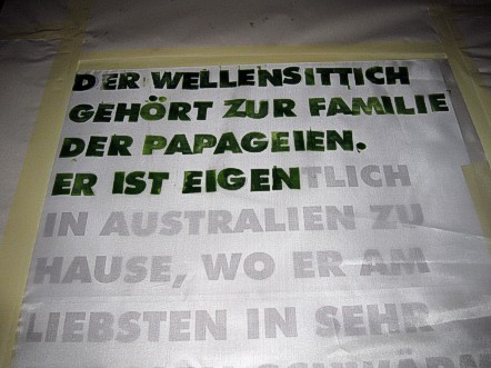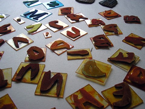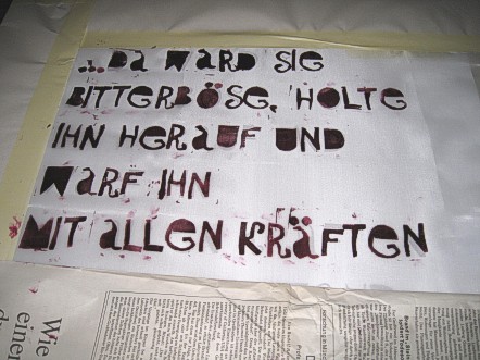 geschnitten und auf Plaxiglasplättchen aufgeklebt. Das durchsichtige Plexiglas ermöglichte es den kleinen Druckern, den Buchstaben sehr genau auf dem Stoff zu platzieren. Eine weitere wesentliche Erleichterung gegenüber dem Arbeiten mit Linoleum, ist die leichte Verarbeitung des Moosgummis. |