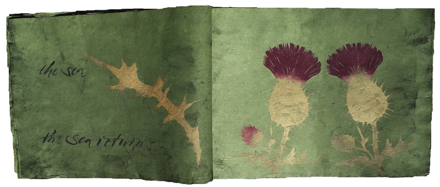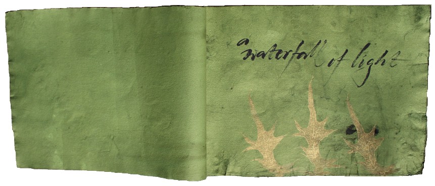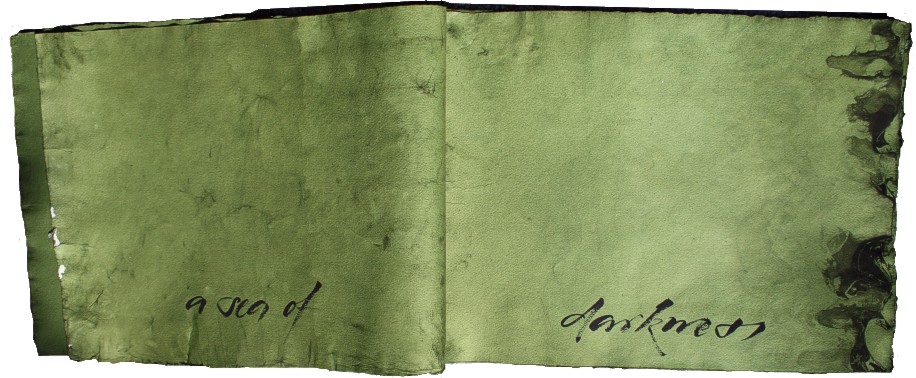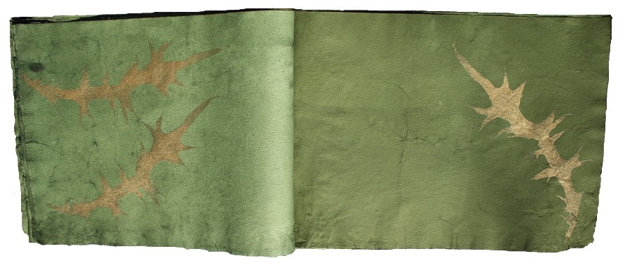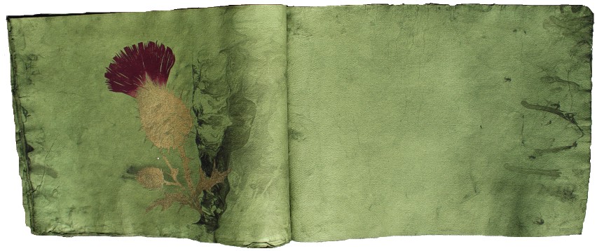 Breite:78 cm Höhe:53cm 8 Seiten aus Hahnenmühle Tiefdruckbütten 120g Papier gefärbt mit Kordel geheftet Motivstempel und Handschrift Entstehung: 2012