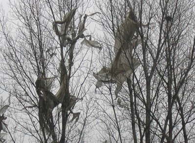 ![]() Eine Abdeckplane für Spargelfelder, die von den Frühjahrsstürmen des letzten Jahres in die Pappeln geweht wurde, hat sich dort hoffnungslos verfangen. Einige Monate lang flatterten die seltsamen Tuch-Geschöpfe nahe der Autobahn bei Groß-Gerau im Wind. Im Frühjahr 2006 fällte die Stadt die Bäume.
