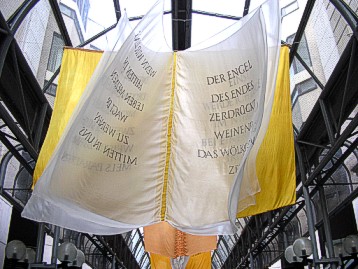 Im Film gehen die Engel an Menschen vorüber und hören deren Gedanken zu. Für den Zuschauer wird das durch ein akustisches Auf- und Abtauchen der Gedanken deutlich gemacht. Geht der Engel weiter, so verklingen die Gedanken der belauschten Person, die nächste Gedankenwelt schwillt schon heran. Es ist dem Engel überlassen, stehen zu bleiben und einen Gedankengang zu Ende zu hören, oder auf seinem Weg nur Bruchstücke davon mitzunehmen. Ähnlich wie im Film, sollen die wehenden Seidenbahnen ihre Textbotschaft nicht komplett und leicht konsumierbar in die Welt hinausschreien. Die Texte sollen vielmehr rätselhaft und fragmentarisch bleiben, ein Flüstern und Verwehen. Wer sich wunderschöne Impressionen von Christio´s Gates anschauen möchte, kann das u.a. auf dieser Seite machen: http://www.christojeanneclaude.net/gates.html |