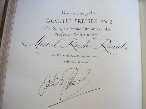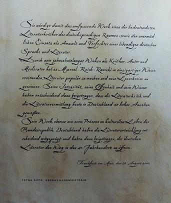 Goethepreis für Marcel Reich-Ranicki auf Pergament, wird später in Pergamentmappe eingebunden.