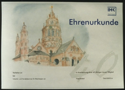Urkunde - Entwurf für die IHK-Mainz mit Aquarell des Mainzer Doms, Schrift wird von Hand eingesetzt.