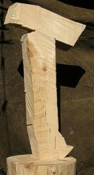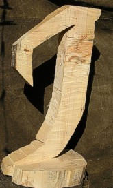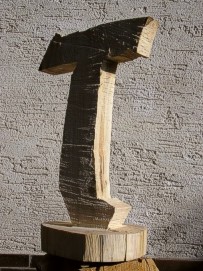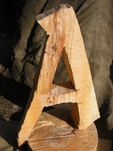 dem Massivholz viel besser verträgt - fragt mich (noch) nicht warum... Gut, vielleicht entspricht die konstruierte, berechnete Form der Grotesken (Schriften nach Bauhaus: Futura usw.) auch unserer Entfremdung vom Körper. Im 20 Jh. spielte der Körper eine immer geringere Rolle - bis zum heutigen Stand, in dem unsere Körper nur noch Computer-Anhängsel sind, die totale Negation des Körperlichen. In dieser Chronologie ist sicher auch die Schriftentwicklung zu sehen. Frühere Schriften wurden von Hand geschrieben. Natürlich entwickelte sich auch die Textur (Gotik ... Fraktur) durch das Handschreiben. Hier spielte das Körperliche noch eine große Rolle. Die klösterlichen Schreiber und später Kanzleischreiber modifizierten Schriften nach ihrem Können und Schönheitsempfinden. Immer war es ein Körper, der im Dialog mit einem Gehirn schrieb. Dies änderte sich. Irgendwann war es ein Gehirn, dass unabhängig von Feinmotorik und Körper seine Formvorstellungen am Reißbrett, später am Bildschirm entwarf. Die Identität, der authentische Atem waren damit raus aus der Schrift. Vielleicht brauchte man unter dem Eindruck des ersten Weltkriegs gerade diese Entkörperung, die Befreiung des Geistes vom leidfähigen Körper. Klare, verlässliche Gedanken als Abgrenzung von einer überkommenen und untergegangenen Welt. Wenn ich nun aber extrem körperbezogen mit der Motorsäge an einem extrem realen Baumstück herumschnippel, dann passt mir die Kopfgeburt Grotesk nicht. Sie passt nicht in den Baumstamm. Klar, ich kann ein Grotesk-N in irrsinnig kurzer Zeit aus dem Holz schneiden, aber es ist zu leicht. Es gibt mir beim Betrachten nicht das Gefühl von Schönheit und Befriedigung, ich bin einfach nur fertig. Dazu ist mir das Holz zu schade. Es sollte mehr sein.
