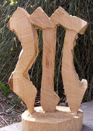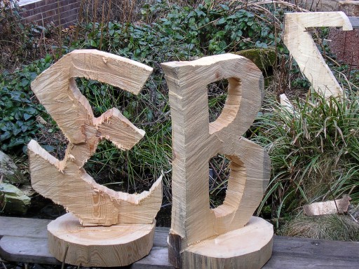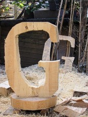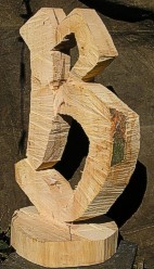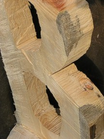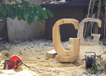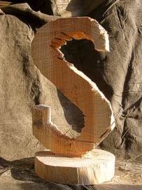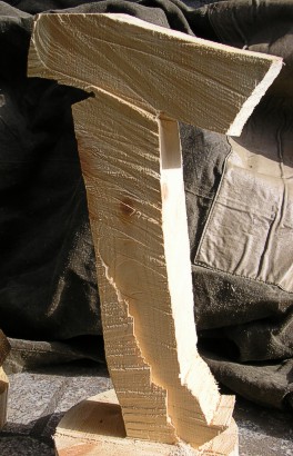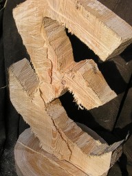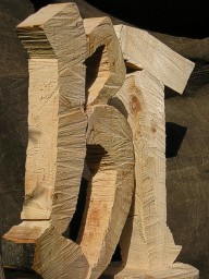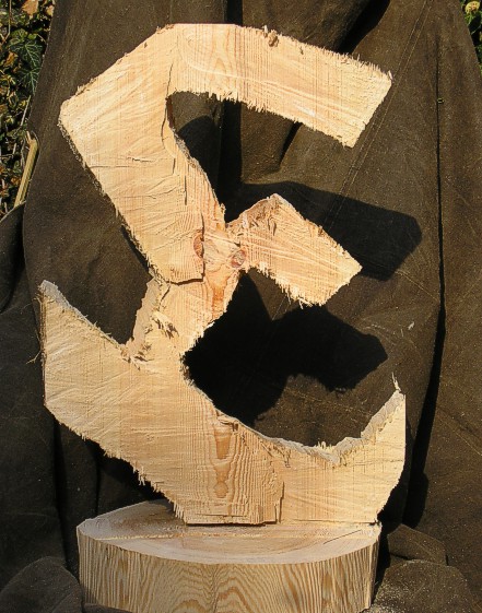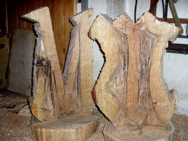 Ich bekomme jede Menge "kurzes Holz" und somit Sollbruchstellen - kaum zu vermeiden. Der G-Kopf wird wohl irgendwann abbrechen und repariert werden müssen. Das frische Holz ist so feucht, dass mir beim Sägen des Splintholzes der Strobe regelrecht Tropfen ins Gesicht sprühen. Auch bei langsamem Trocknen an einem luftigen Platz draußen bilden sich erste Trockenrisse um den Kern. Ich lerne, dass ich das Reißen günstig beeinflussen kann, wenn ich das Holz um den Kernbereich herum mit Ponal versiegele. Im Prinzip ist nichts gegen Risse einzuwenden, das Holz darf arbeiten und "leben". Die abgebrochenen Teile werden mit Dübeln und Leim wieder befestigt. Der Buchstabe verändert sich also auch nach der eigentlichen Gestaltungsarbeit. Er gestaltet sich selbst weiter. Die Risse werden immer tiefer, Teile sind unverhohlen wieder angeleimt. So bekommt jede Skulptur einen speziellen Charakter, der von Wachstum und Versehrtheit zeichnet. Körper, die ihre Wunden nicht verbergen können, die fragmentiert oder notdürftig repariert sind. Die nicht so tun, als wäre das Leben ein ewig andauernder Schönheitswettbewerb.