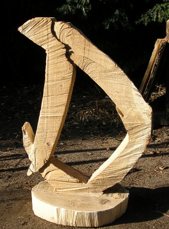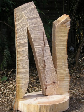 In welcher Form kann ich existieren? Diese Frage scheint im Innern des Stamms gestellt, jedes Jahr aufs neue, Jahrzehnt um Jahrzehnt. Positionierung des Selbst in der Umwelt scheint auch für Bäume ein tägliche neu zu lösendes Rätsel. Welches Weg wird das Wasser heute nehmen, durch meine Holzfasern und Blätterkapillare? Welche Spuren wird es hinterlassen. Spuren des Strömens, des Stauens, des Nachgebens und Erzwingens. Wasser und Licht haben diesen Stamm geformt zu einem einzigartigen Stamm. Sein Inneres spricht in einer anderen Sprache vom Leben als wir - und doch spricht er. Seine Berichte vom Leben sind verborgen und müssen mit der Säge aus der dunklen Stille herausgeschält werden. Eine andere Art des Zuhörens kennen wir nicht.* Der Akt des Sägens erscheint brutal und unangemessen, kostet Überwindung. Aber ist das Leben selbst immer sanft und rücksichtsvoll? Geht es nicht ebenso kompromisslos und zielgerichtet seine Weg? Geburt ist kein sanftes Ereignis sondern stets auch ein Gewaltakt. Berichtet der Stamm von der Suche des Baums nach seiner Lebensform, so sucht der Bildhauer nach der Form, die seinem Leben entspricht. Wieder wird die Frage gestellt: “In welcher Form kann ich existieren?”. Diese Form wird dem Widerstand des Stammes abgerungen. Zu jeder Antwort muss man sich durchbluten/durchharzen. Der Bildhauer muss Entscheidungen treffen und sie durchsetzen. Wir sind auf der Suche nach einer Form, die uns entspricht - um uns zu beweisen, dass wir auch Stamm und zugleich nicht Stamm sind. |