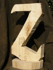 Das L spiegelt sowohl Fraktur, als auch handschriftlichen Duktus wieder. Obwohl die Eiche schon ein Jahr lang abgelagert ist, reißt sie in den fröhlich vor sich hin...
