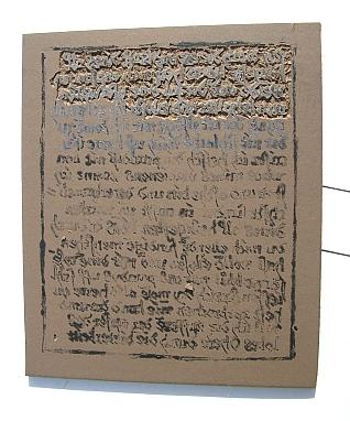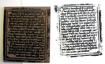 Übertrag einer mit Aquarellfarbe geschriebenen Seite auf Linoleum.