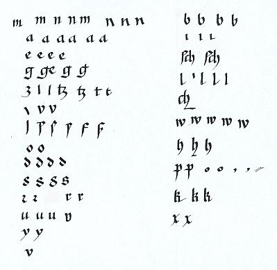 Hier die Vorlage aus den Typen unseres Blockbuchs. Ich habe für fast alle Buchstaben mehrere Lösungen