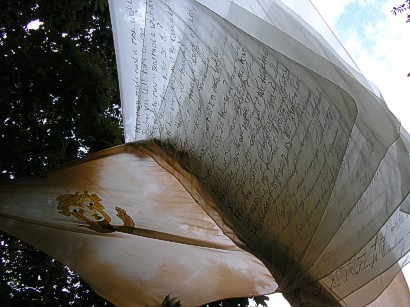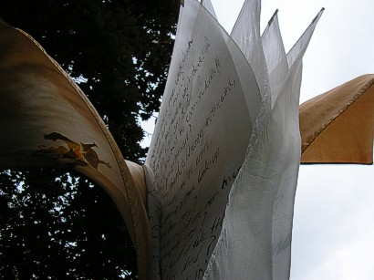 steht offen und seine Flügel sind ausgespannt. Der Engel der Geschichte