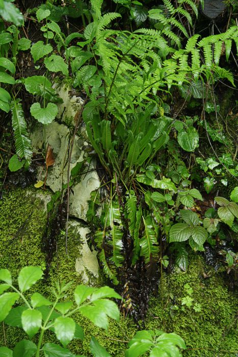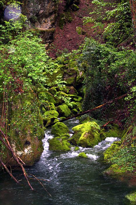 eine Quelle, verborgen im Wald, zwischen Felsen und Farnen, irgendwo am Berghang |