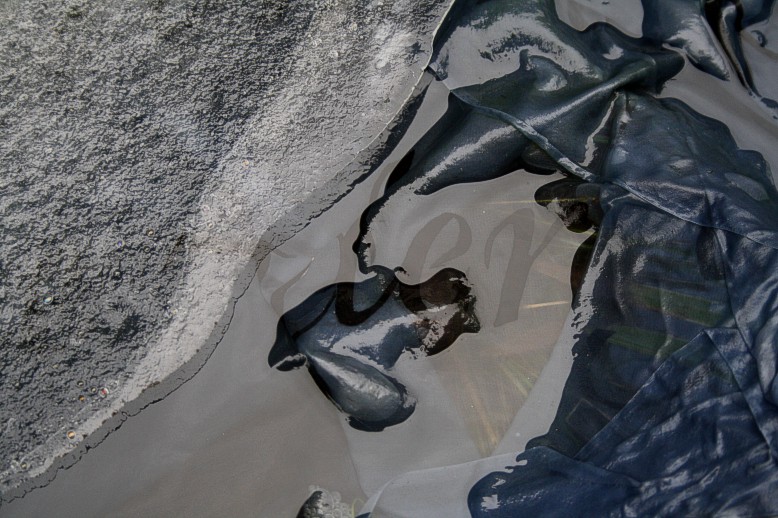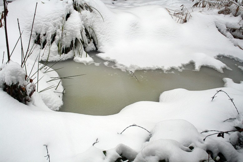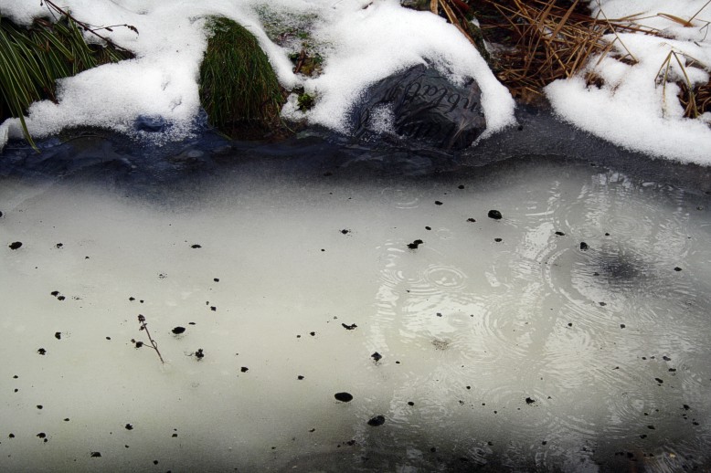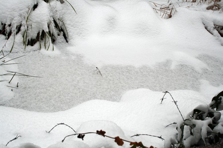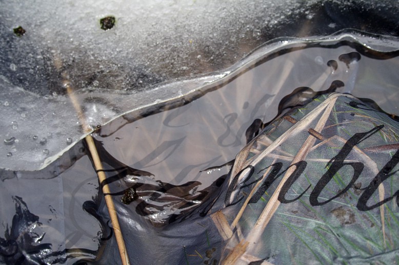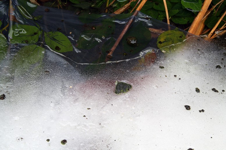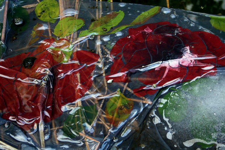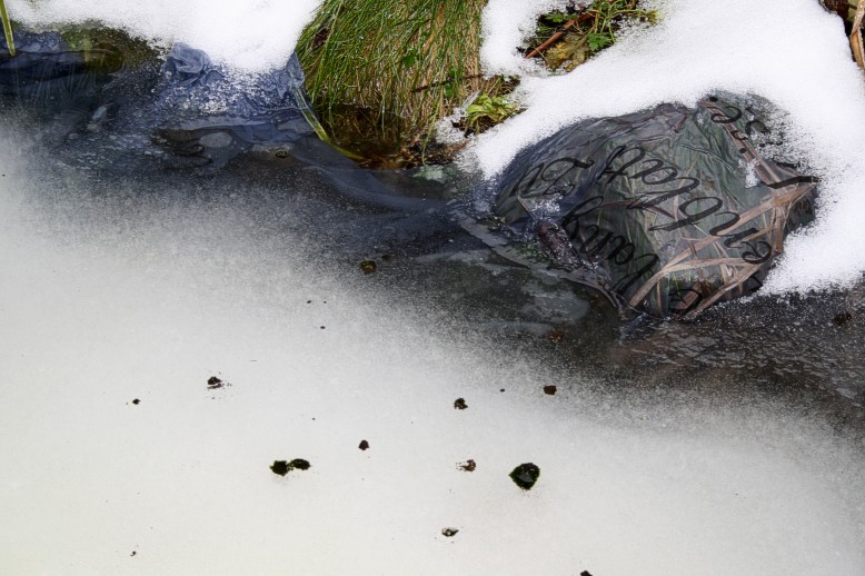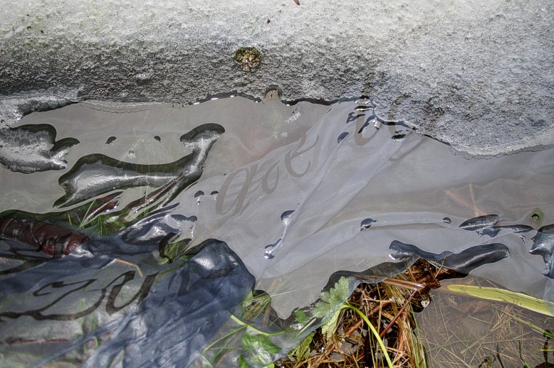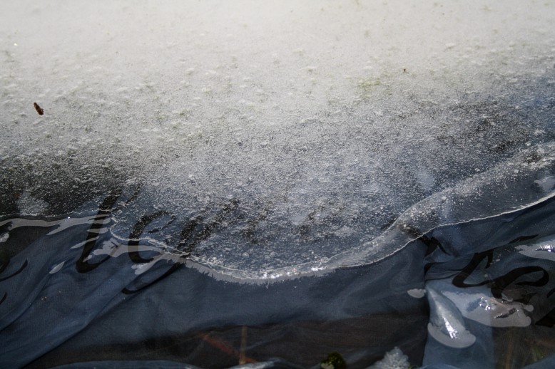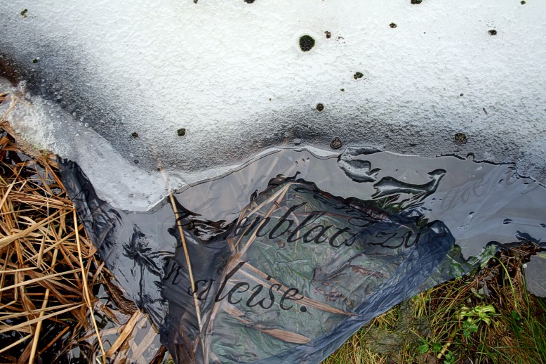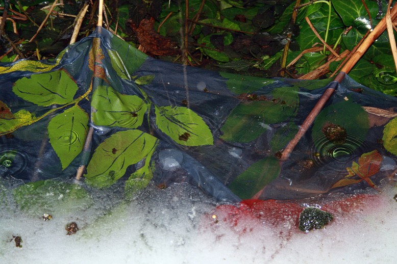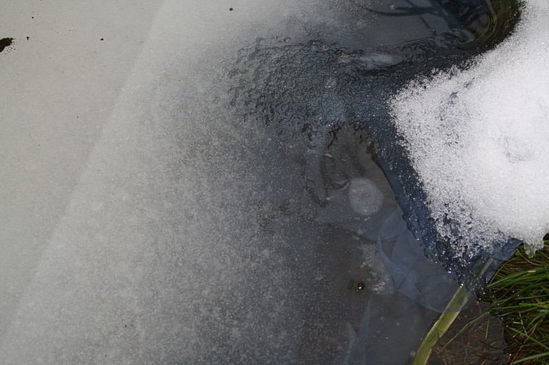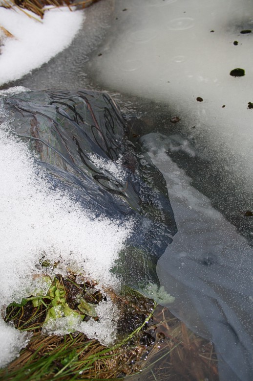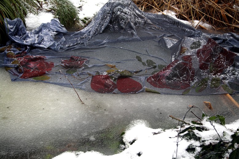 Das blaue Rosentuch lag im Teich, fror ein und taute wieder auf.