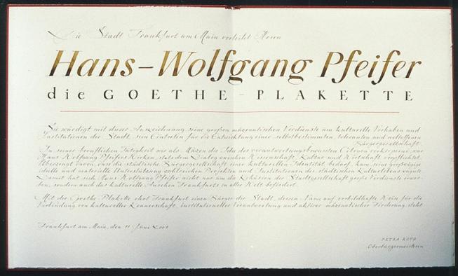 "Goethe-Plakette" der Stadt Frankfurt am Main für Herrn Hans-Wolfgang Pfeifer, 11.6.2001