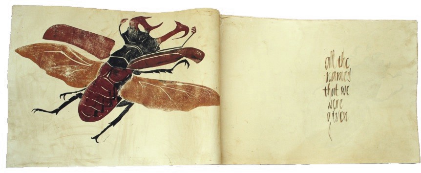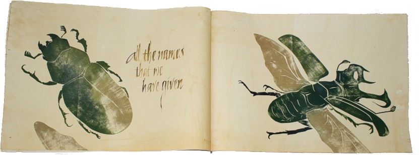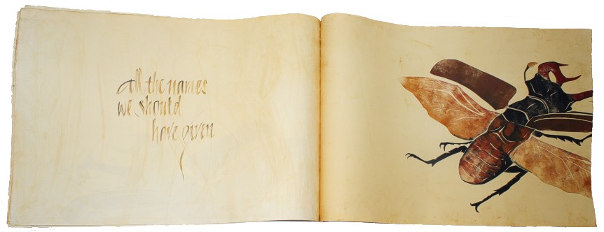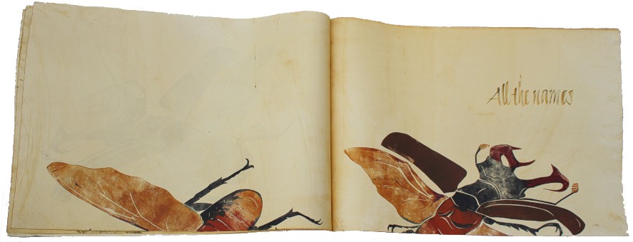 Breite:78 cm Höhe:53cm 5 Seiten aus Hahnenmühle Tiefdruckbütten 120g Papier gefärbt mit Kordel geheftet Motivstempel und Handschrift Entstehung: 2012