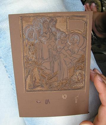 Alle Teilnehmerinnen bekamen den Arbeitsauftrag, eine der 26 Seiten zu erstellen. Jeder einzelne Arbeitsschritt wurde dabei möglichst originalgetreu nachvollzogen - vom Schreiben der mittelalterlichen Bastarda-Type und Übertragen der Motive auf einen Druckstock über das Schneiden dieser Formen und anschließende Drucken, bis hin zum Kolorieren mit historischen Pigmenten und dem Einbinden in eine Pergamentdecke. Da die Arbeitszeit innerhalb eines Semesters sich als recht knapp erwies, begann ich diesen Werkstattbericht im Internet zu führen. Es ermöglichte es mir, auch zwischen der wöchentlichen Sitzungen mit den Kursteilnehmerinnen die Auseinandersetzung zu vertiefen und voran zu treiben. Ich richte mich daher in den nachfolgenden Texten immer an meine Studentinnen.