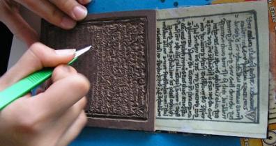 Erfindung des Buchdrucks. Es sind Bücher, bei denen jede Seite komplett in eine Holzplatte