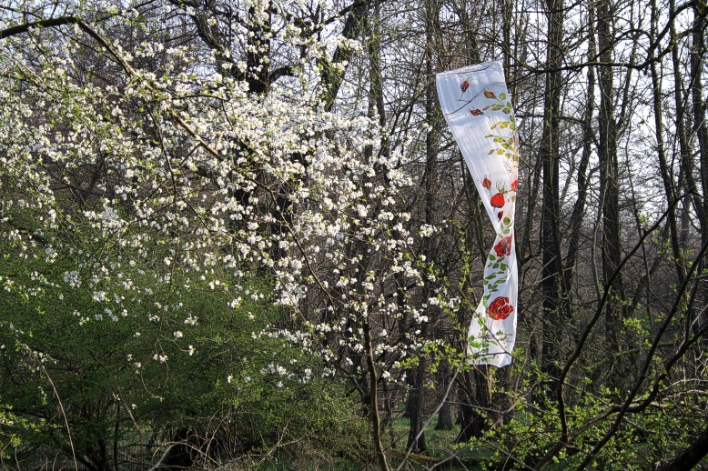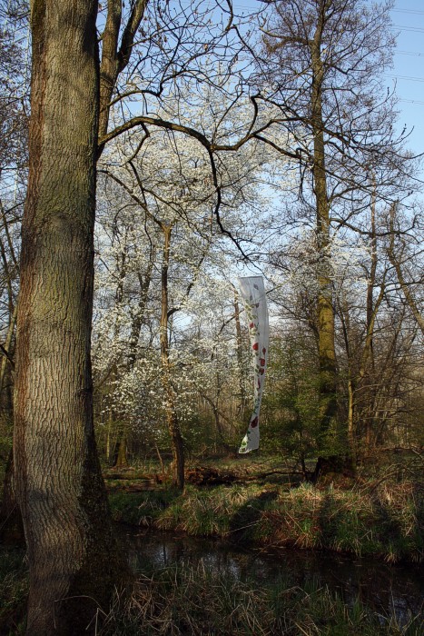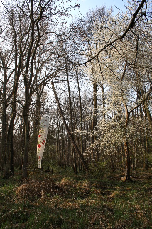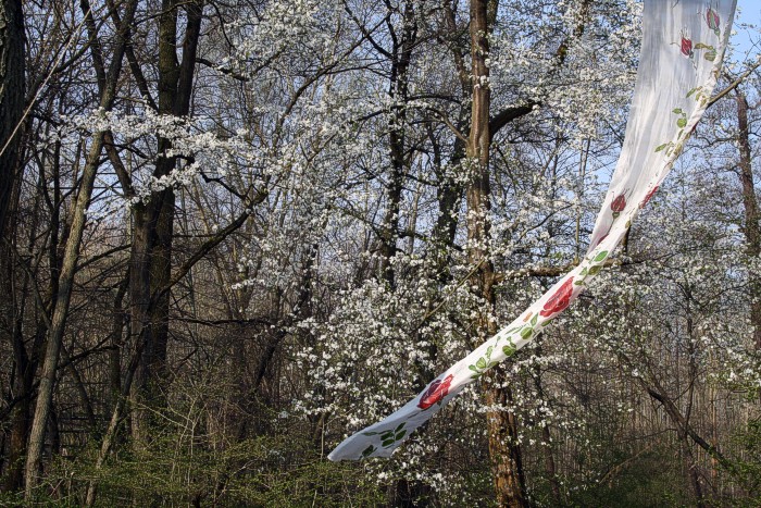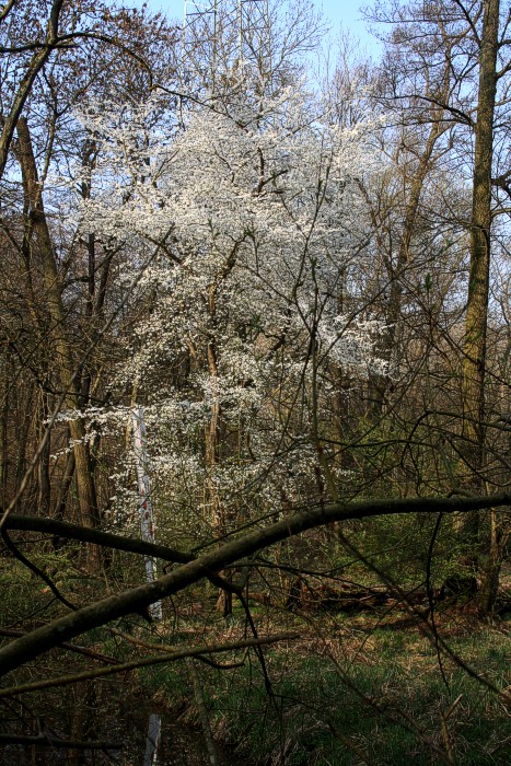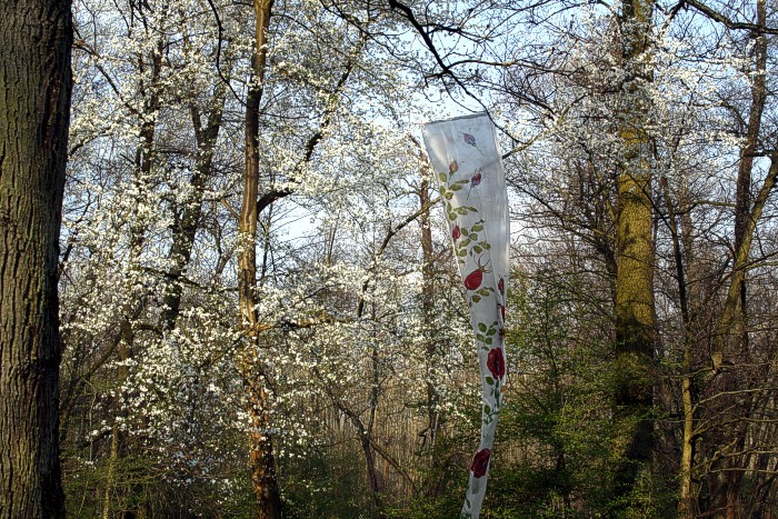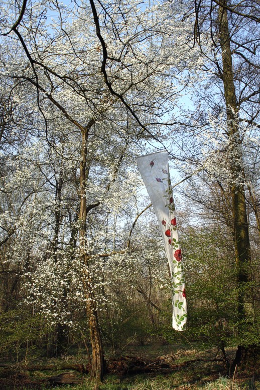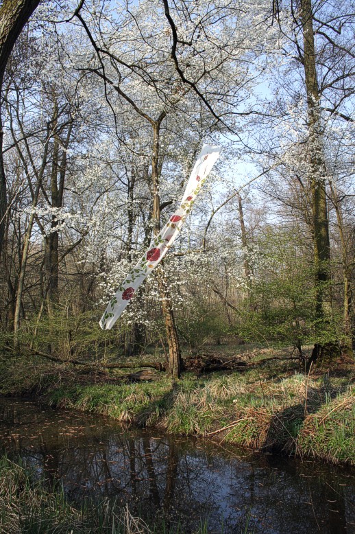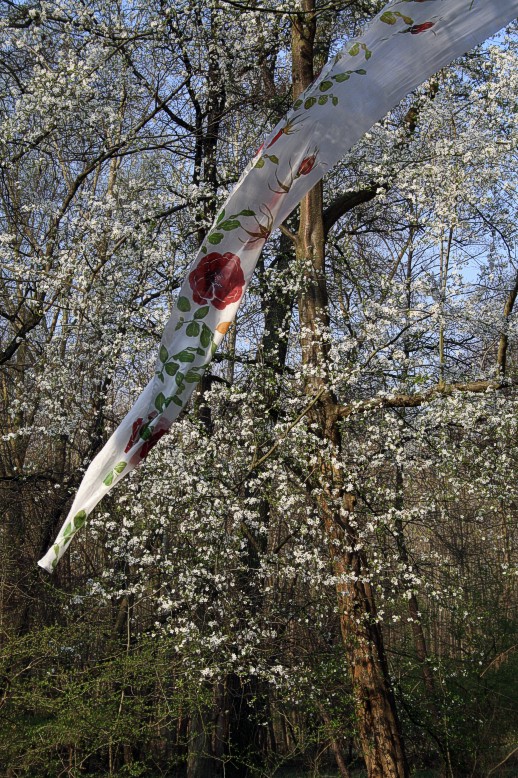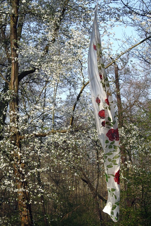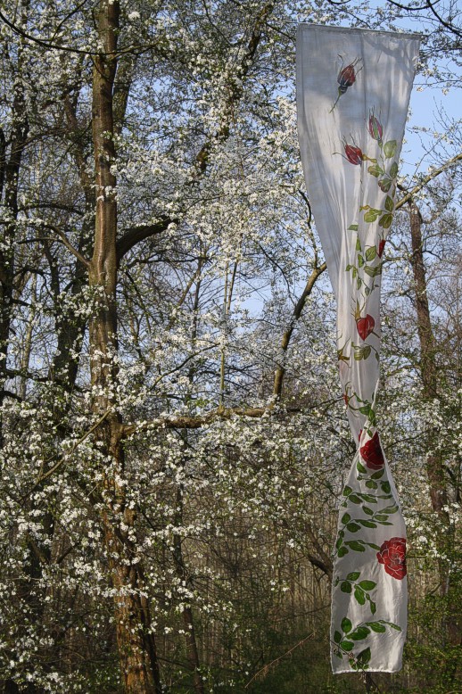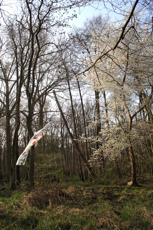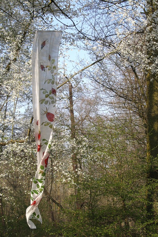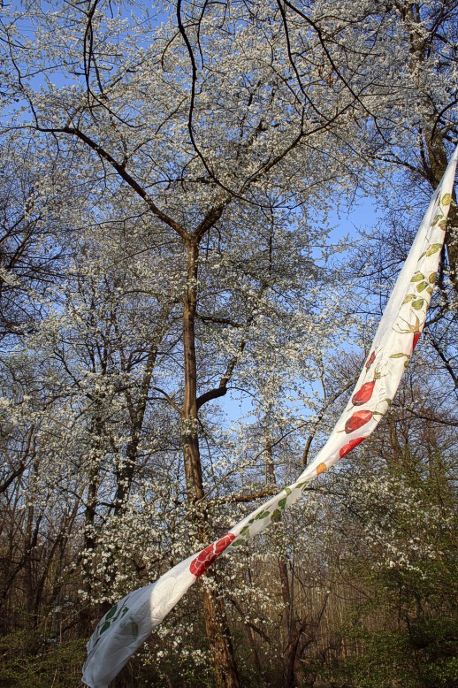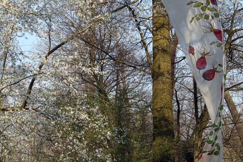 Das Rosentuch am Morgen des 30. März bei einer Wildkirsche im Bruchwald