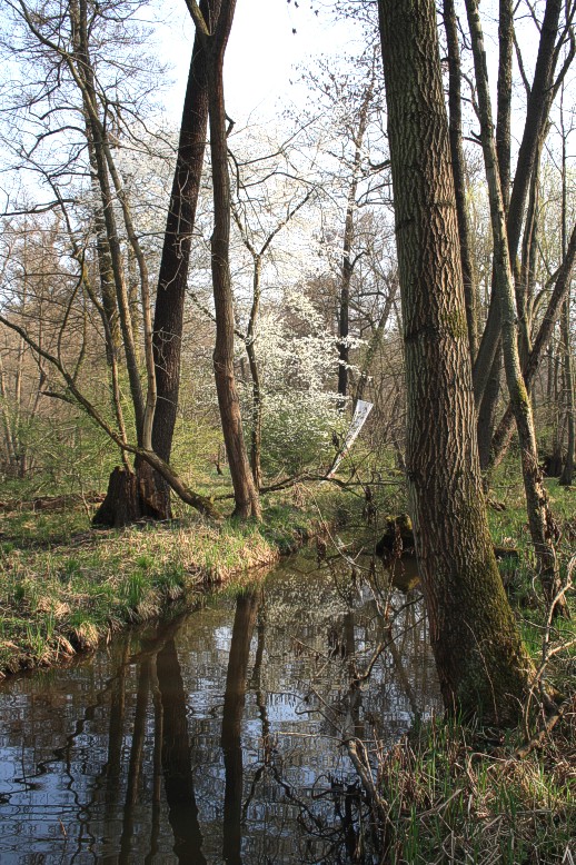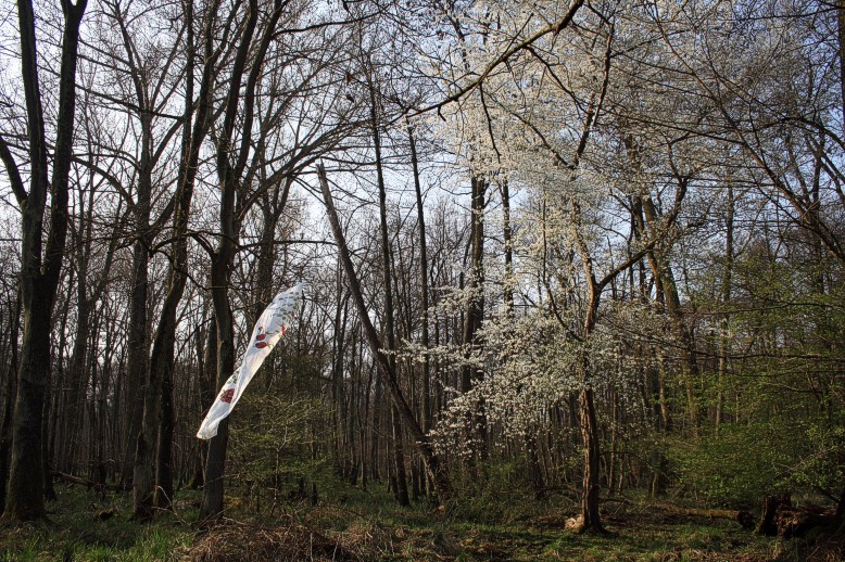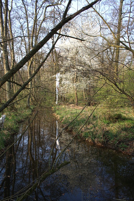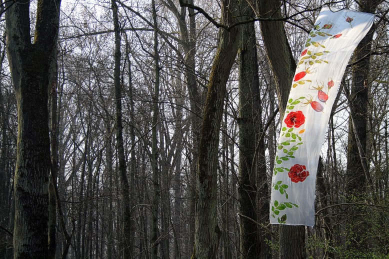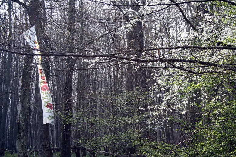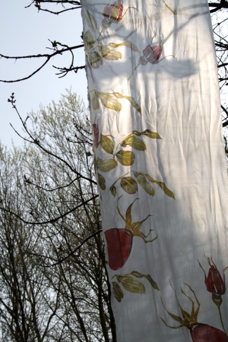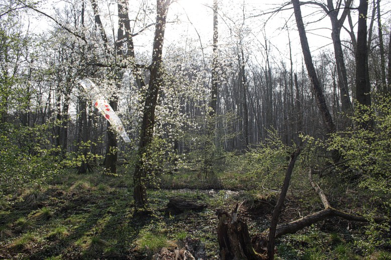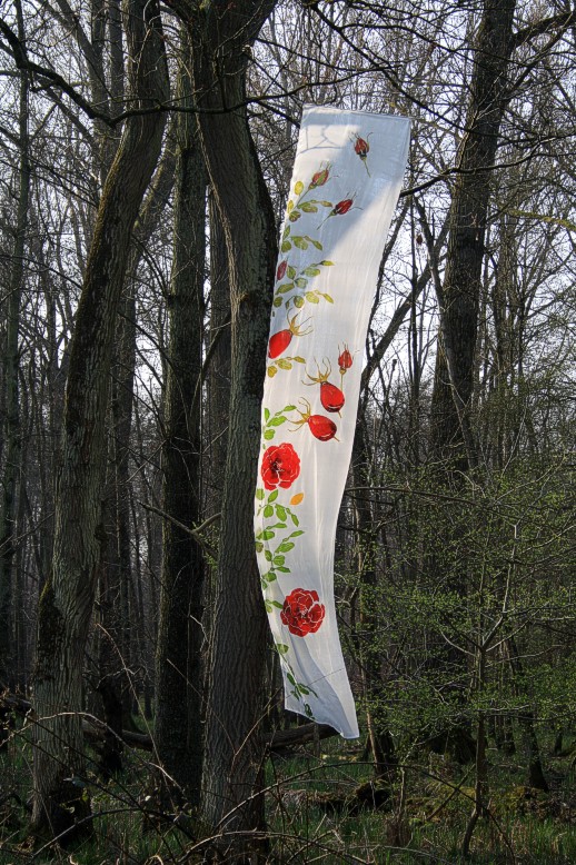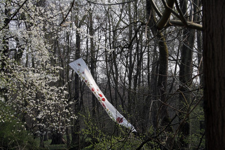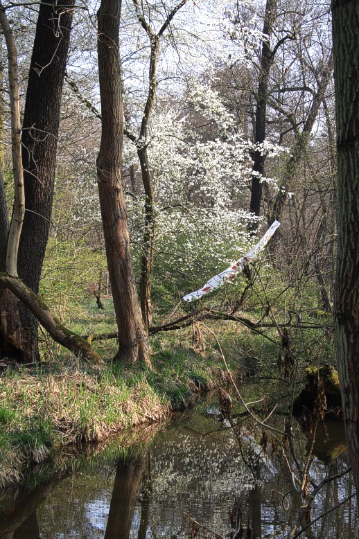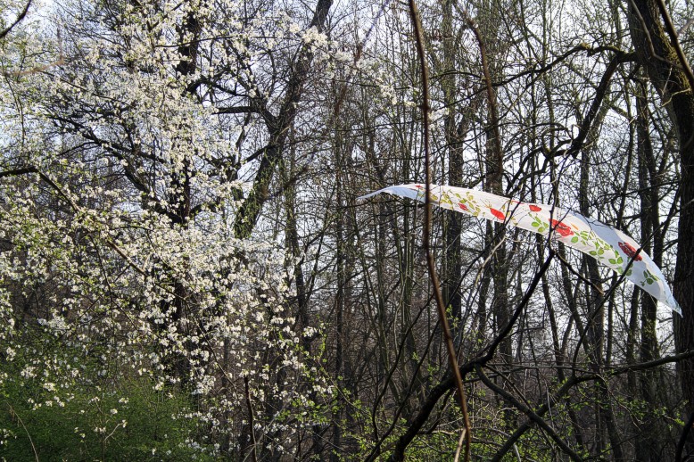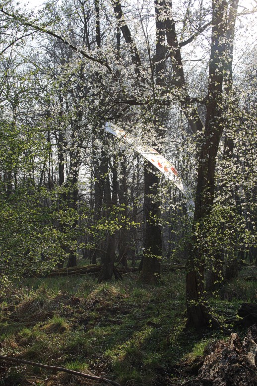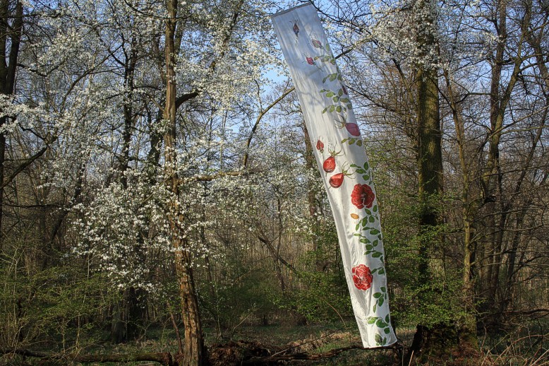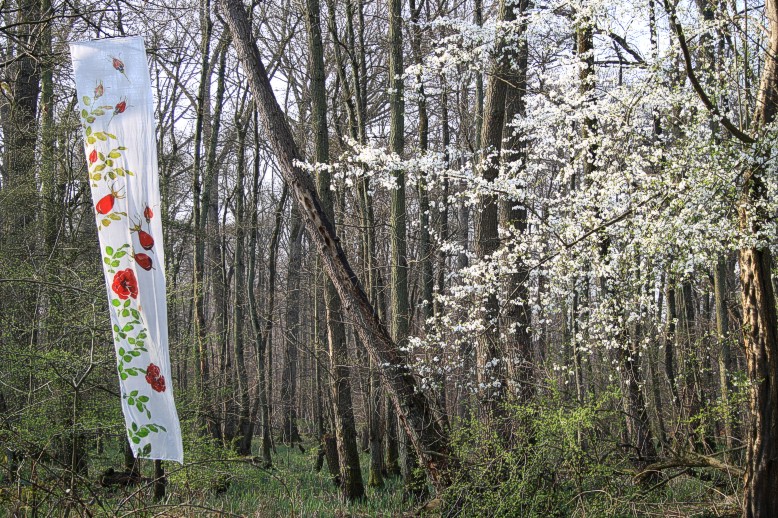 Das Rosentuch am Morgen des 30. März bei einer Wildkirsche im Bruchwald