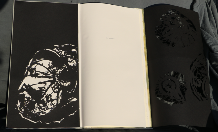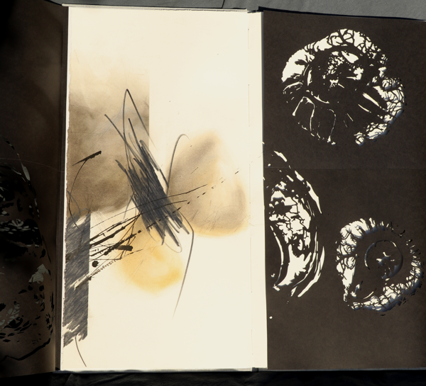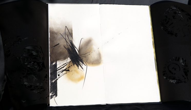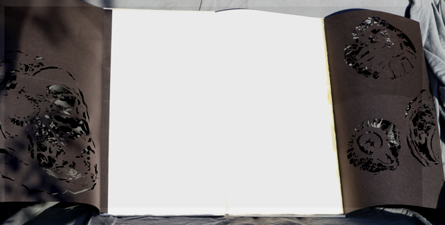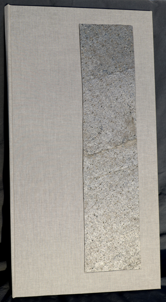 Gemeinschaftsproduktion von drei Unikatbüchern zu einem Konzept Format: 30 x 59 cm Seitenzahl: 8 Entstehung: 2025/26 Hardcover/ hellgrauer Leinenbezug mit Intarsienschiefer
