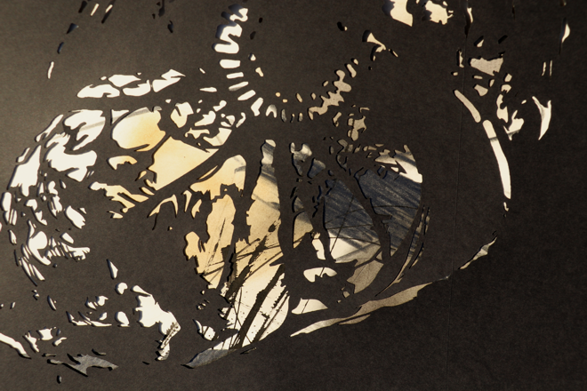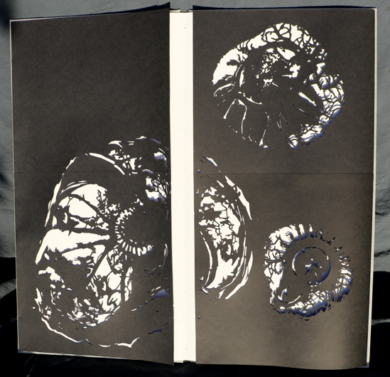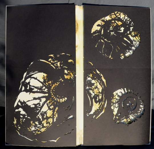 Zwei Flügel-Scherenschnitte sind seitlich im Deckel befestigt und können auf- und zu geklappt werden. Sie zeigen fiktive Urtierchen oder Einzeller,..., Getaltung von Stephan Flommersfeld |