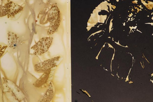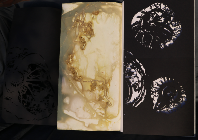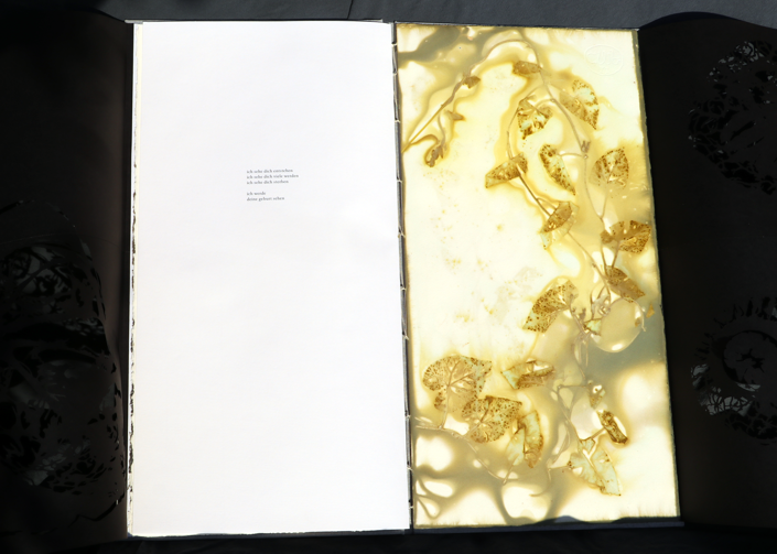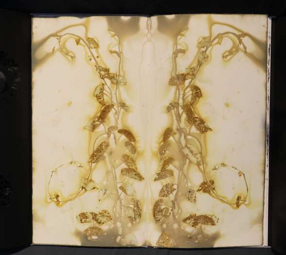 Coproduction of three unique artistbooks with the same concept wide: 30 cm, high: 59 cm pages: 8 hardcover, fine linnen, ecoprinted 2025/26 Hardcover, Linnen and inlay of slate |