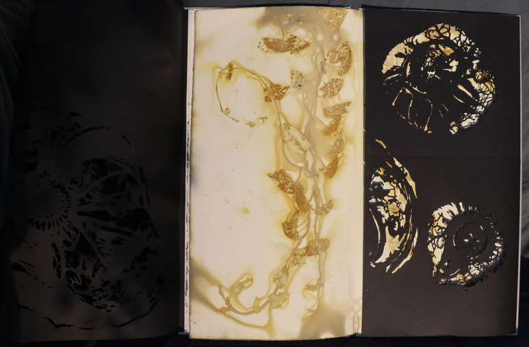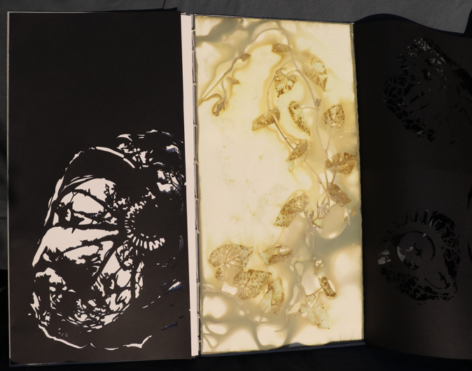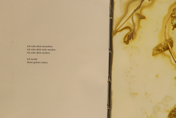 Coproduction of three unique artistbooks with the same concept wide: 30 cm, high: 59 cm pages: 8 hardcover, fine linnen, ecoprinted 2025/26 Hardcover, Linnen and inlay of slate |